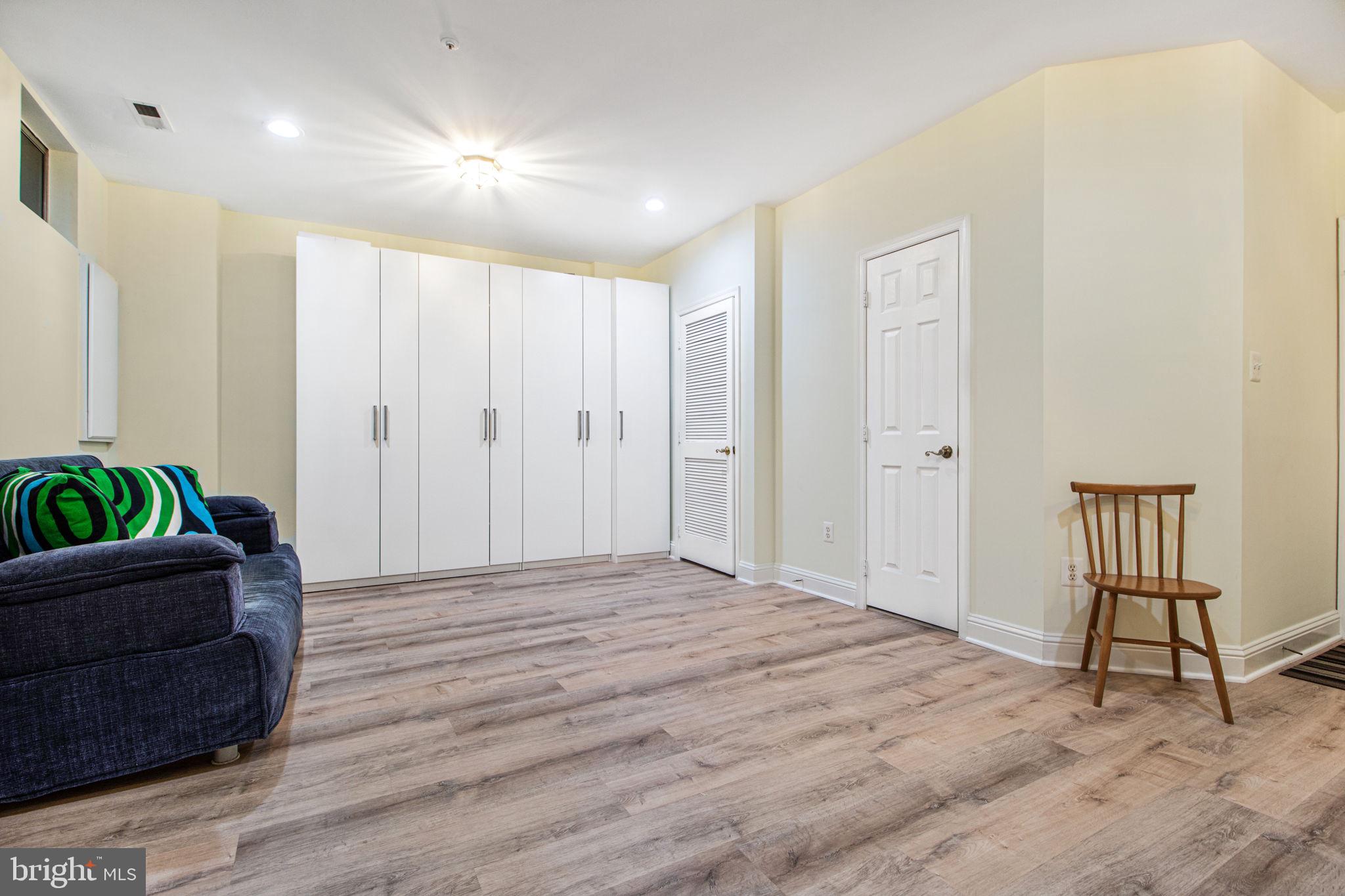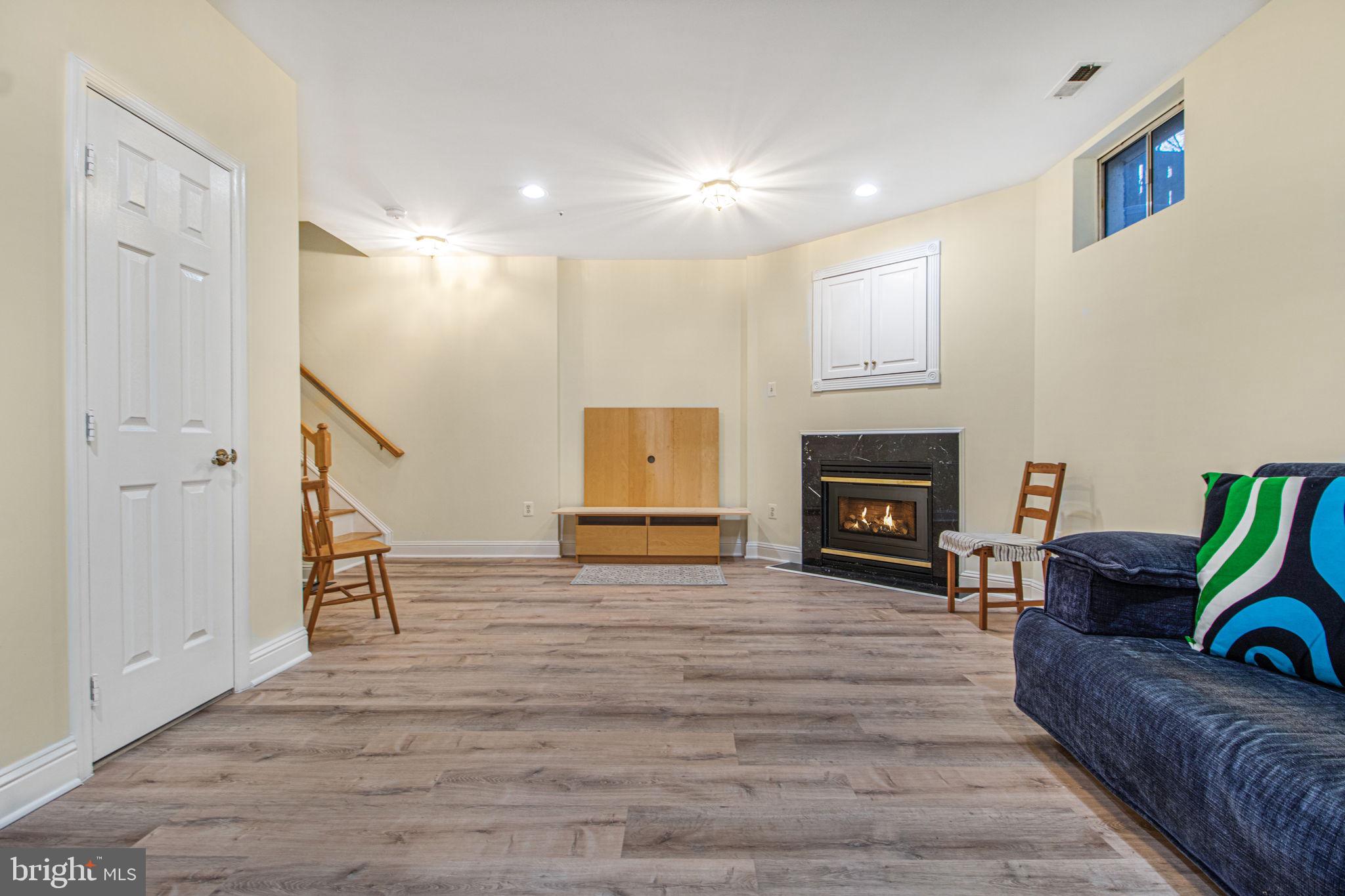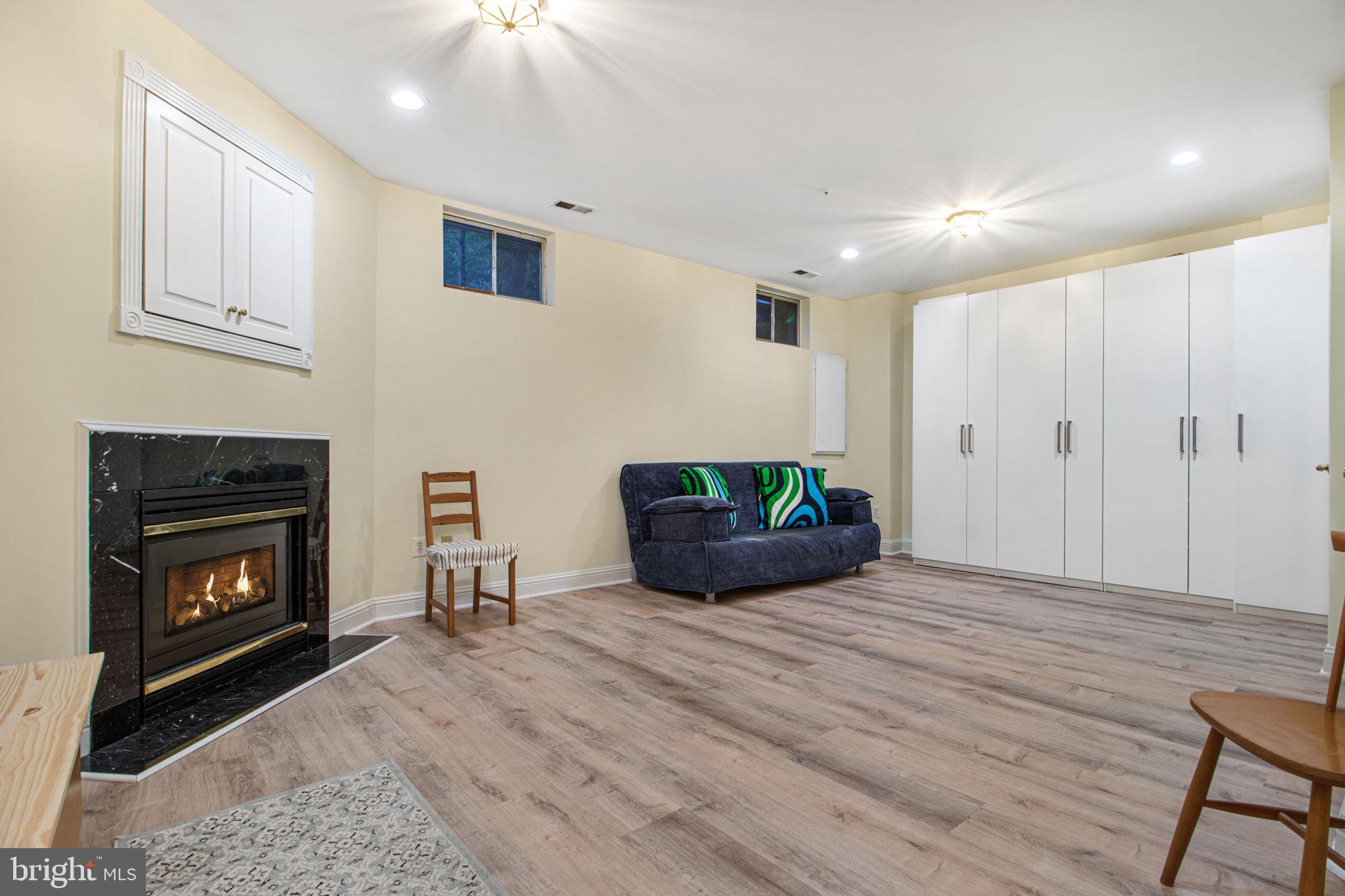 The walkout lower level provides versatile living space, including a cozy recreation room with a gas fireplace, a built-in storage closet, and a half bathroom.