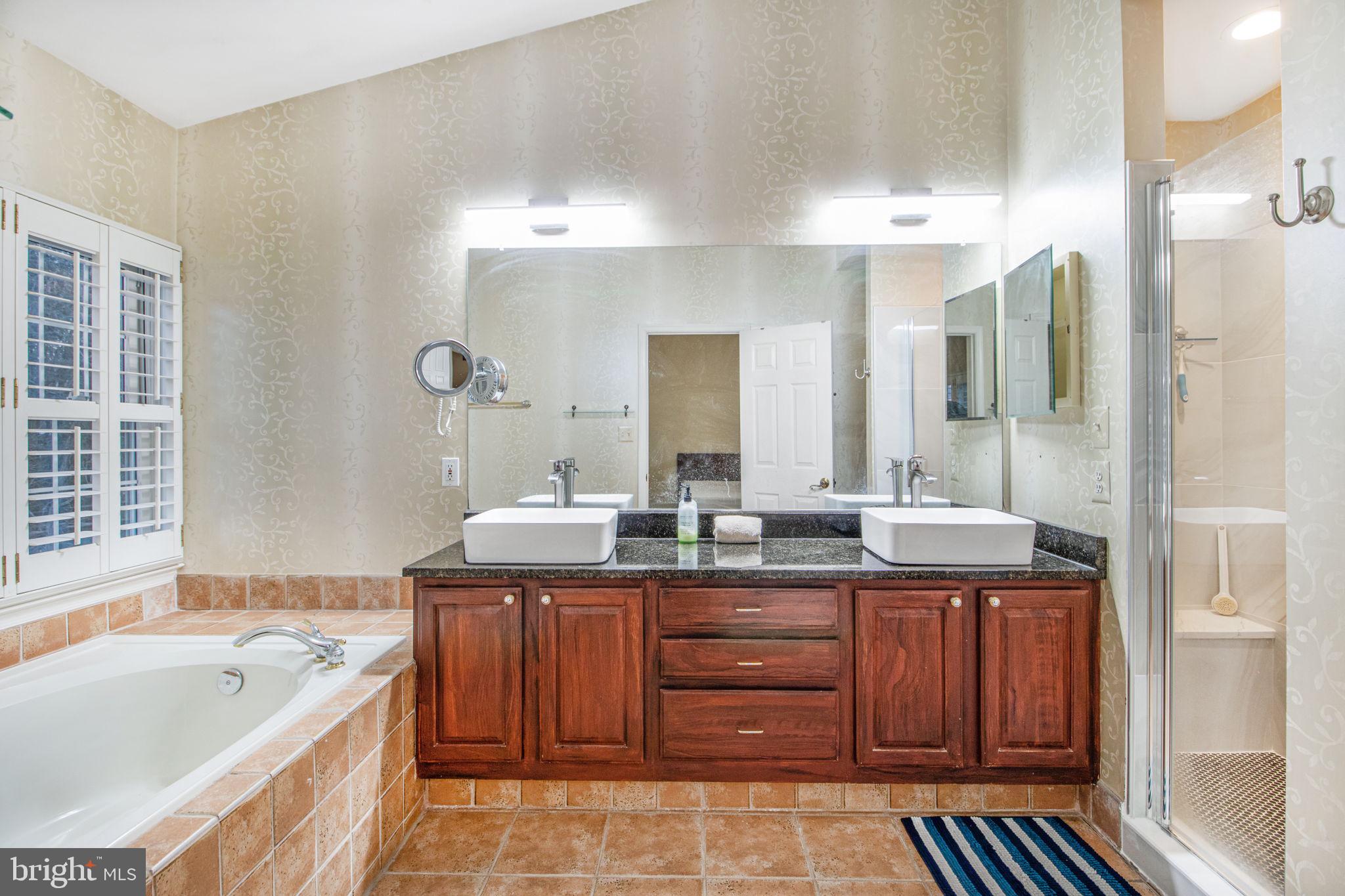 Upstairs, the upper level offers a sanctuary of comfort with three high-ceiling bedrooms, two full baths, and a convenient laundry area. The master suite is a highlight, featuring a vaulted ceiling, abundant natural light, a custom walk-in closet, and a spa-like ensuite bath with a double sink vanity, soaking tub, and separate shower. Two additional bedrooms share a spacious hall bath.