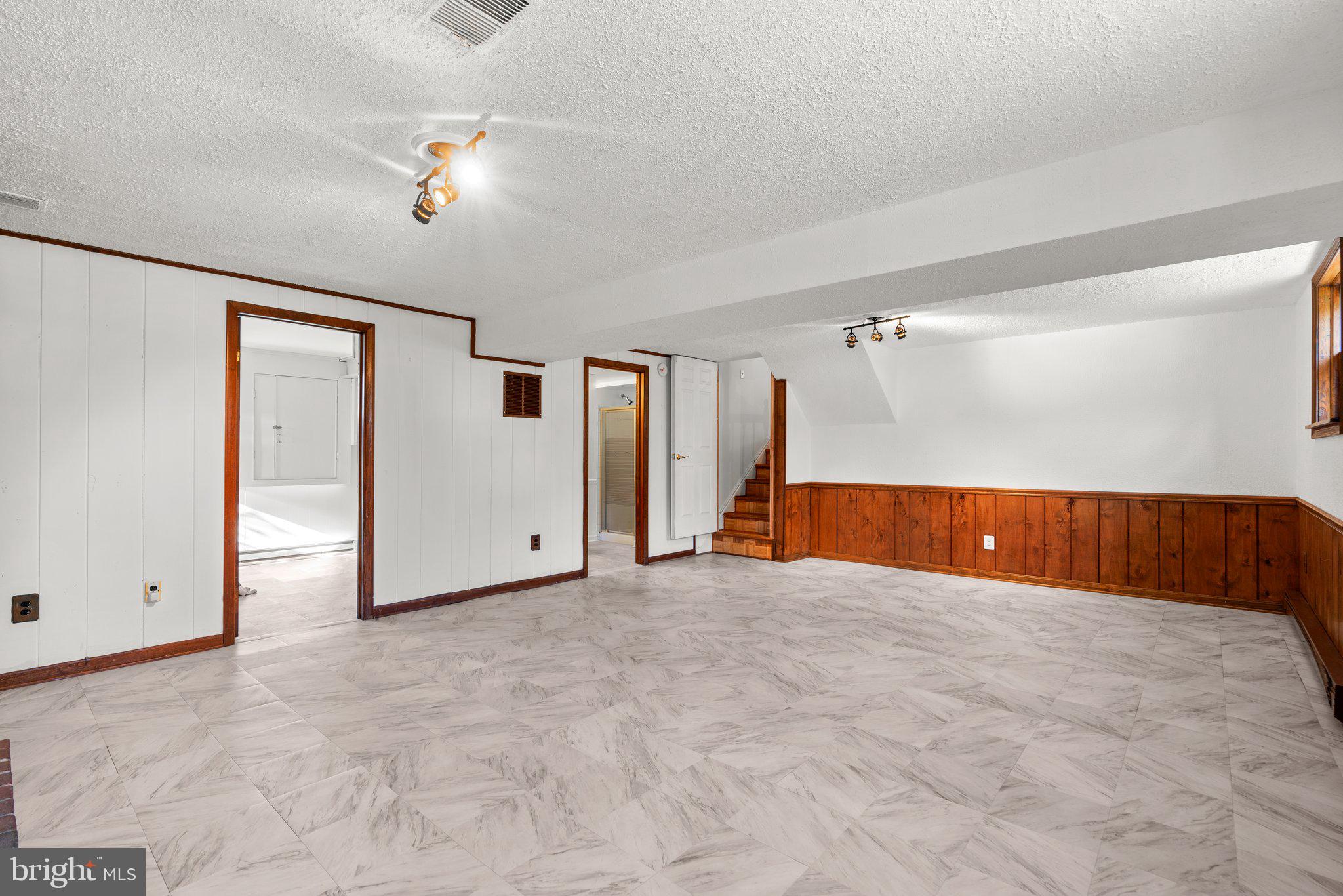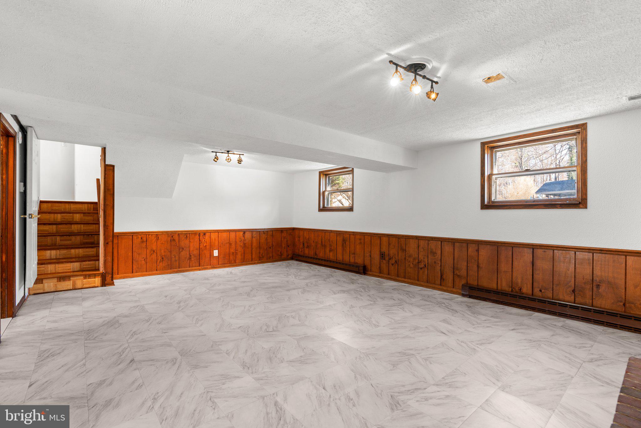 The lower-level multi-purpose room features a brick wood-burning fireplace, shelving with new flooring, and provides a cozy retreat. Temperature control is a breeze with individually controlled baseboard heating for freezing temperatures, central heating for milder weather, and central air conditioning for warm seasons. Storm windows and doors are installed throughout for added comfort.