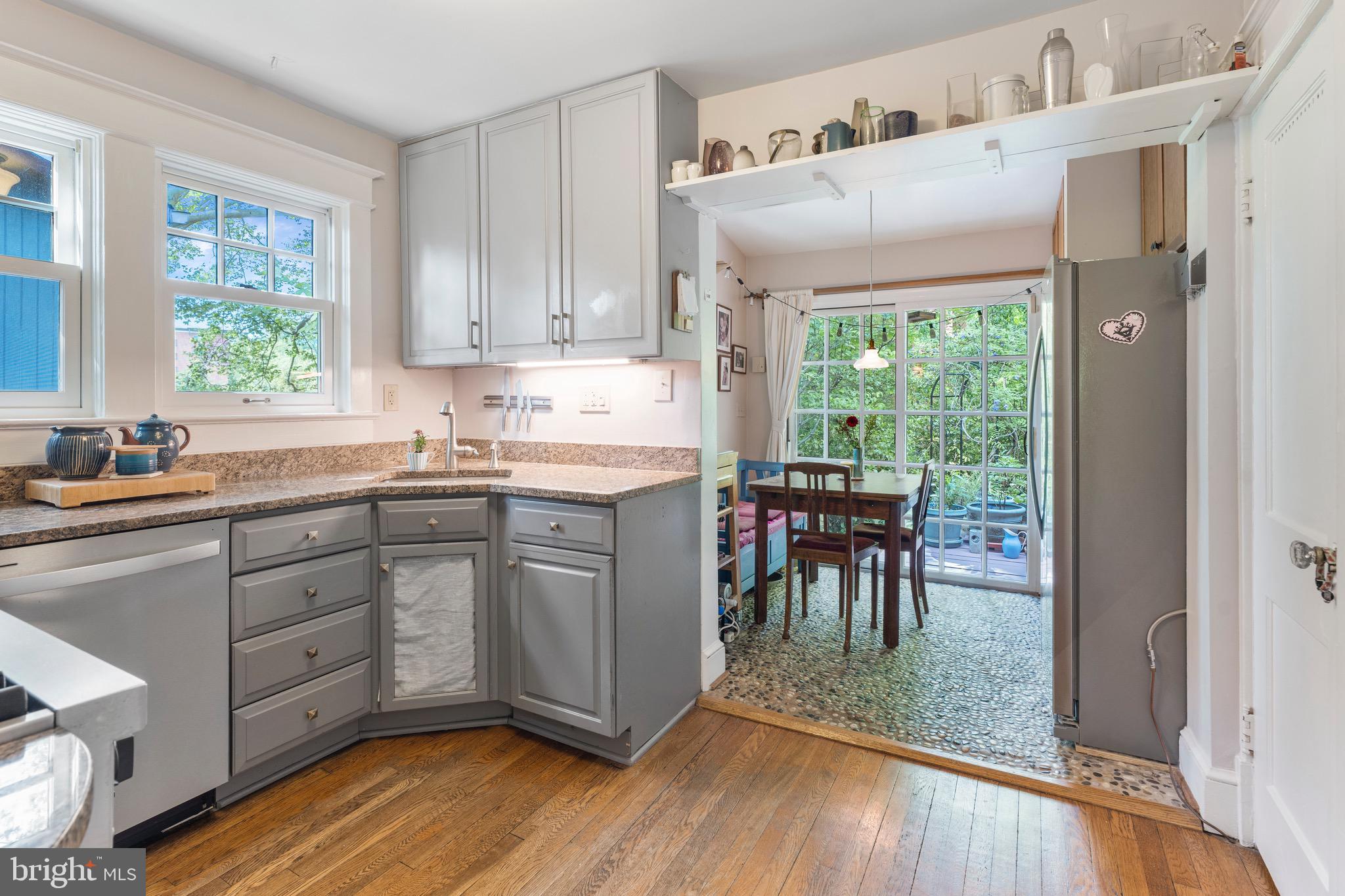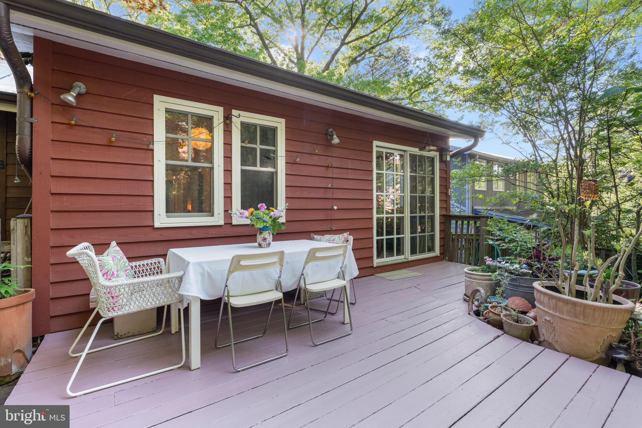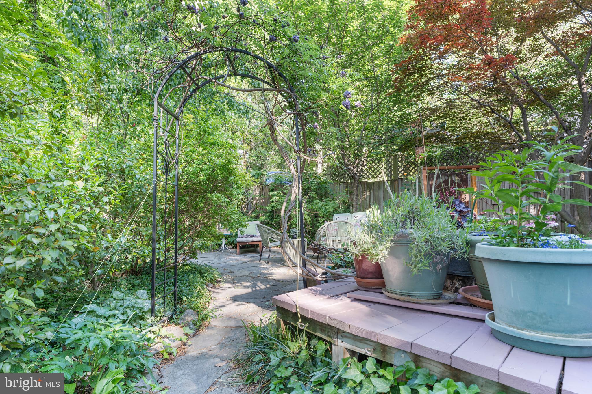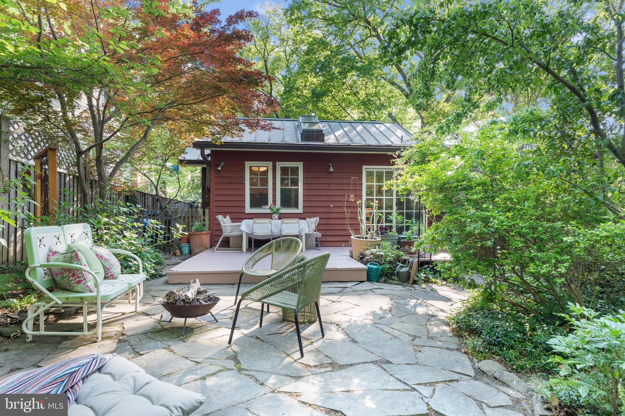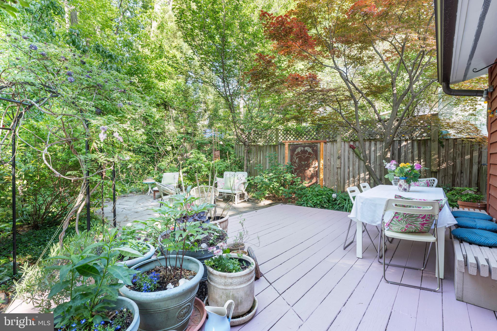 Outside, the backyard is a gardener's dream, filled with native plantings that bloom across three seasons. The space is perfect for unwinding, with a wooden deck ideal for entertaining outdoor dinners and a stone patio offering ample space to lounge around a fire pit. You'll find Eastern redbud and dogwood trees (both white and red), two kinds of fig trees with bountiful harvests, a persimmon tree, a mature Japanese cherry tree, and a Japanese maple. The front yard features azaleas in three different colors, rhododendron, and three giant hydrangeas, along with a beautiful stone wall, adding an element of craftsmanship to the landscape. Additionally, the home holds a green home certification from Takoma Park, emphasizing its commitment to sustainability.