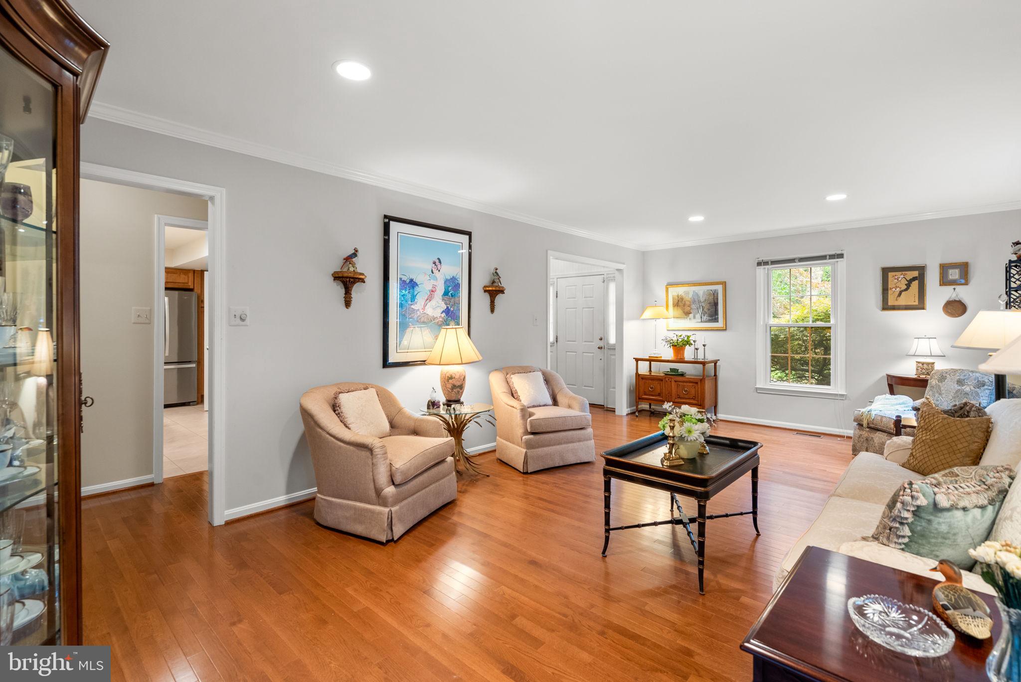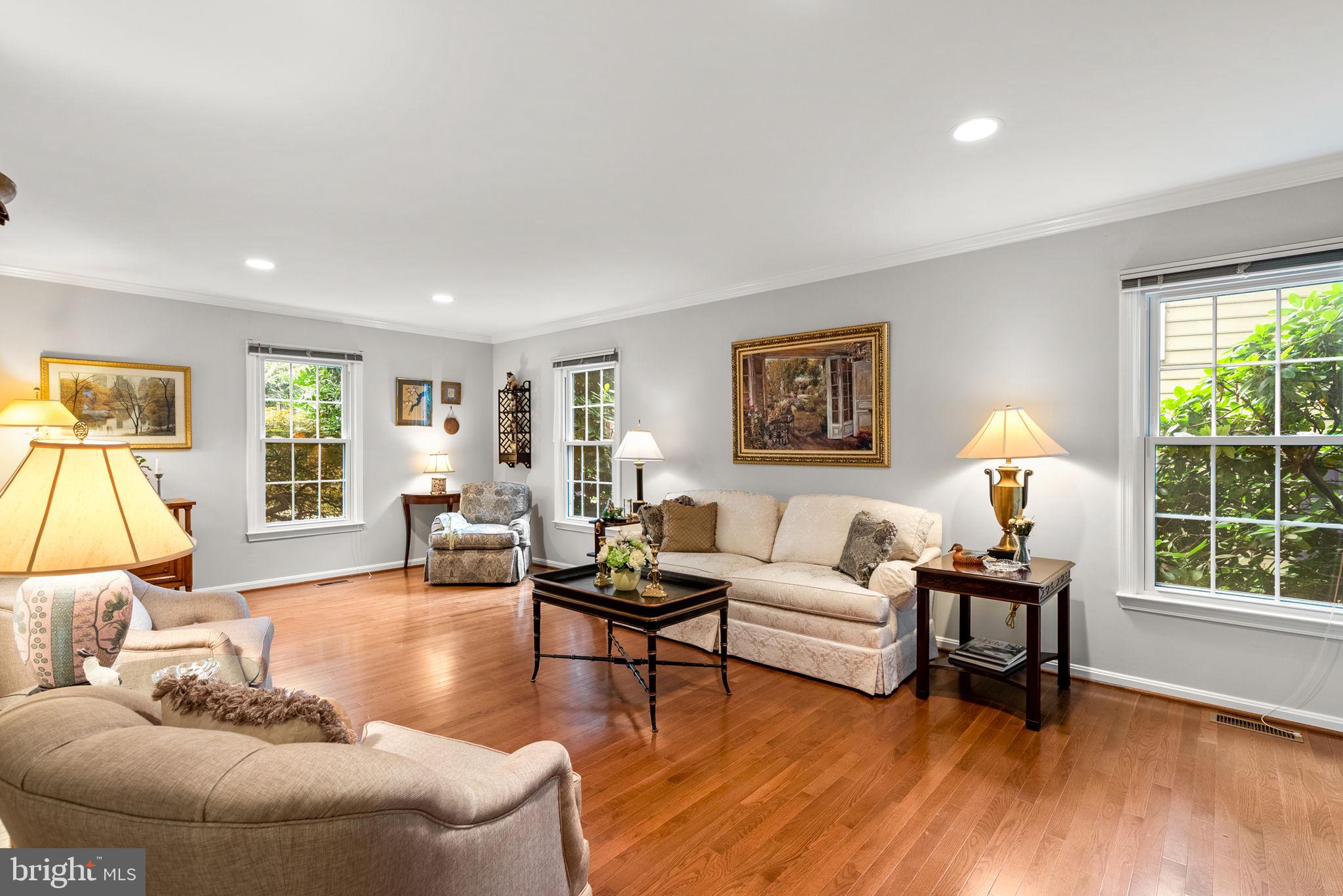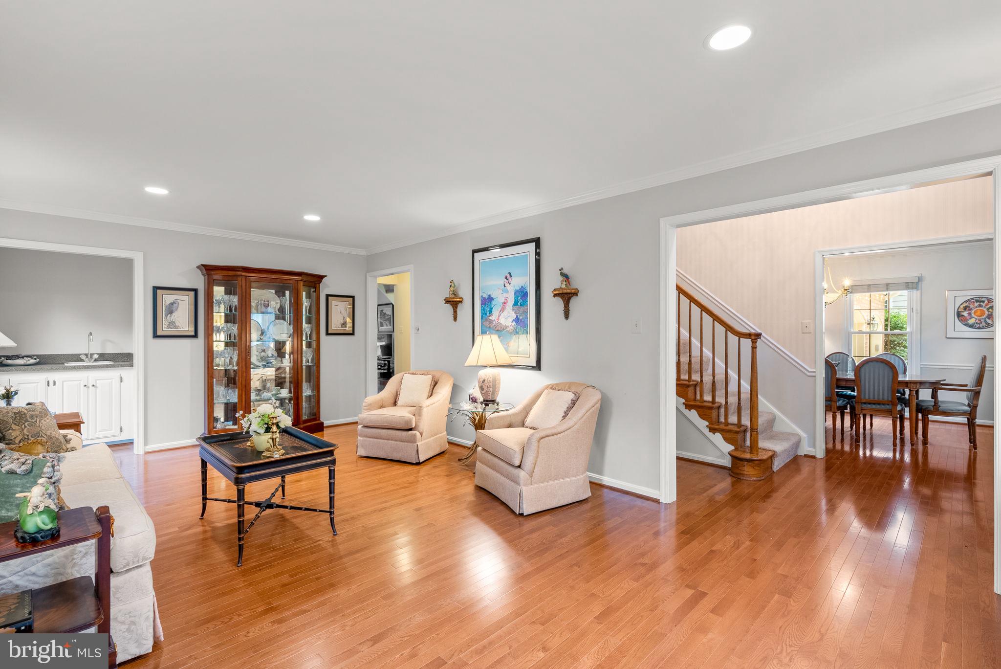 Nestled on a quiet, tree-lined street in the sought-after Washingtonian Woods community, this New England-style home combines timeless charm with modern updates. The traditional floor plan features a welcoming two-story foyer, an embassy-sized living room with crown molding, hardwood floors, and wet bar, and a formal dining room that flows into the renovated Chef's kitchen. The kitchen offers a center island, 42-inch custom cabinetry, stainless steel appliances, and designer granite countertops, opening to a sun-filled breakfast room and a dramatic two-story family room with gas burning fireplace, full window surround, rear staircase, and access to a private custom deck. A spacious mudroom/laundry room provides extra storage, a walk-in closet, and access to the two-car garage.
