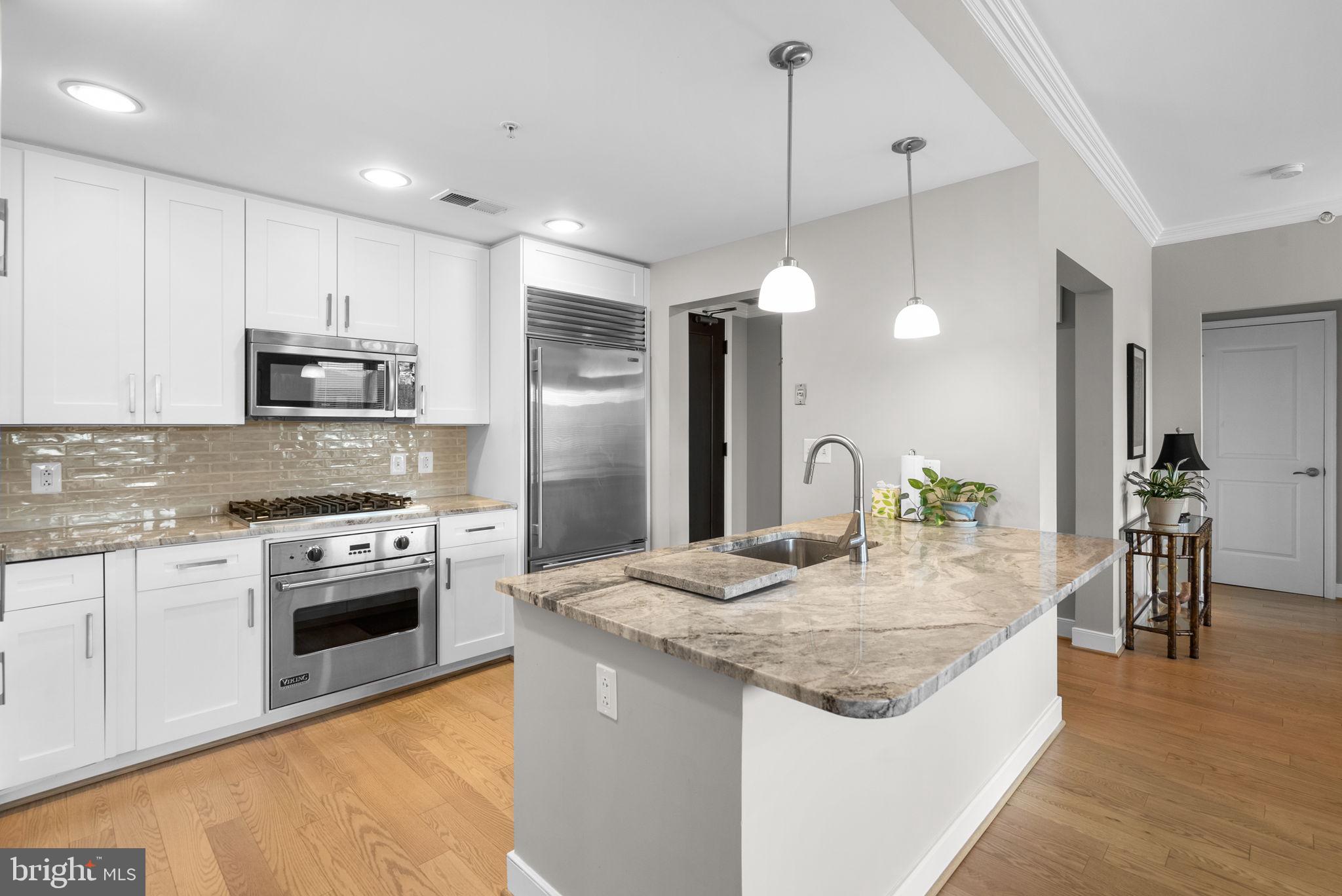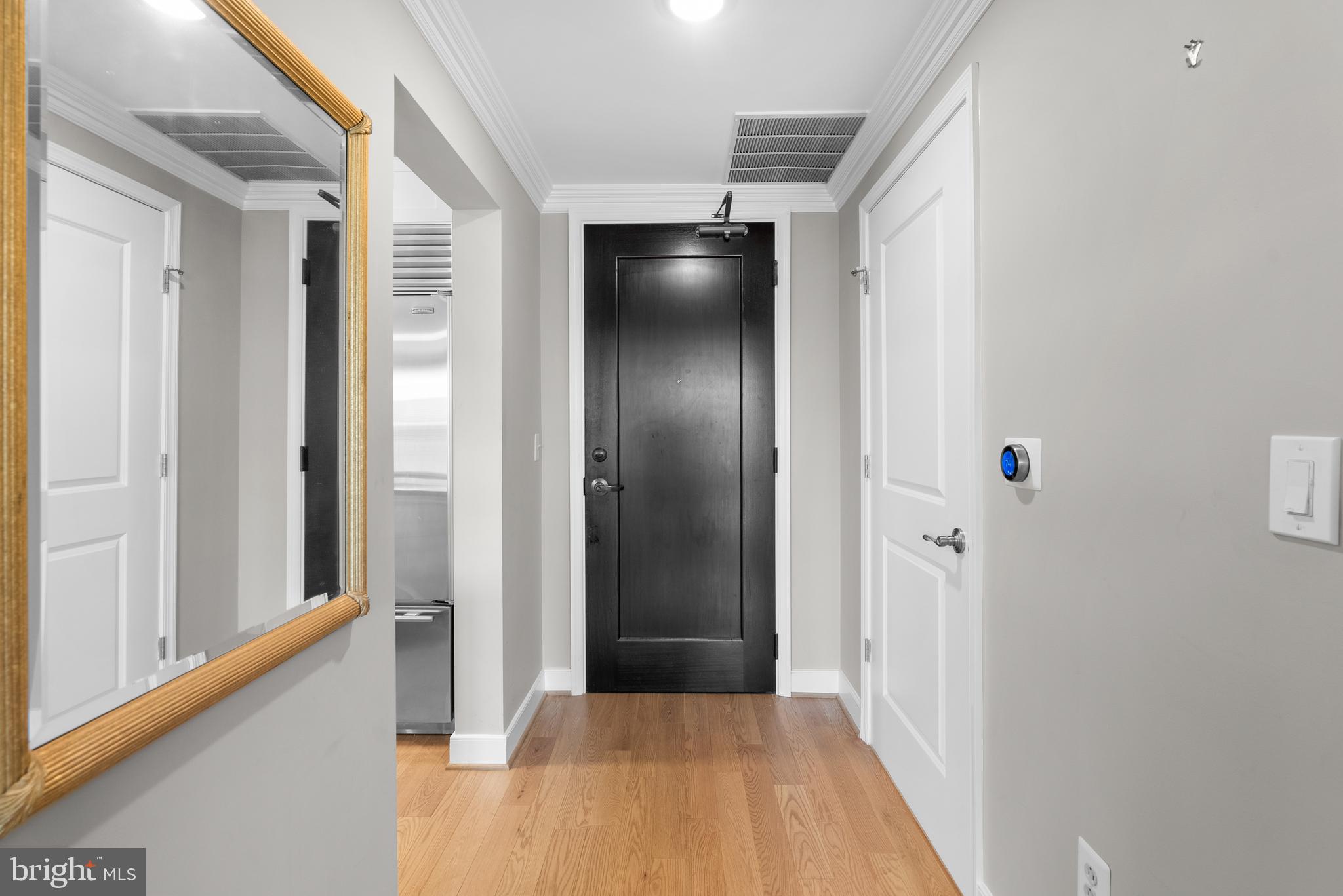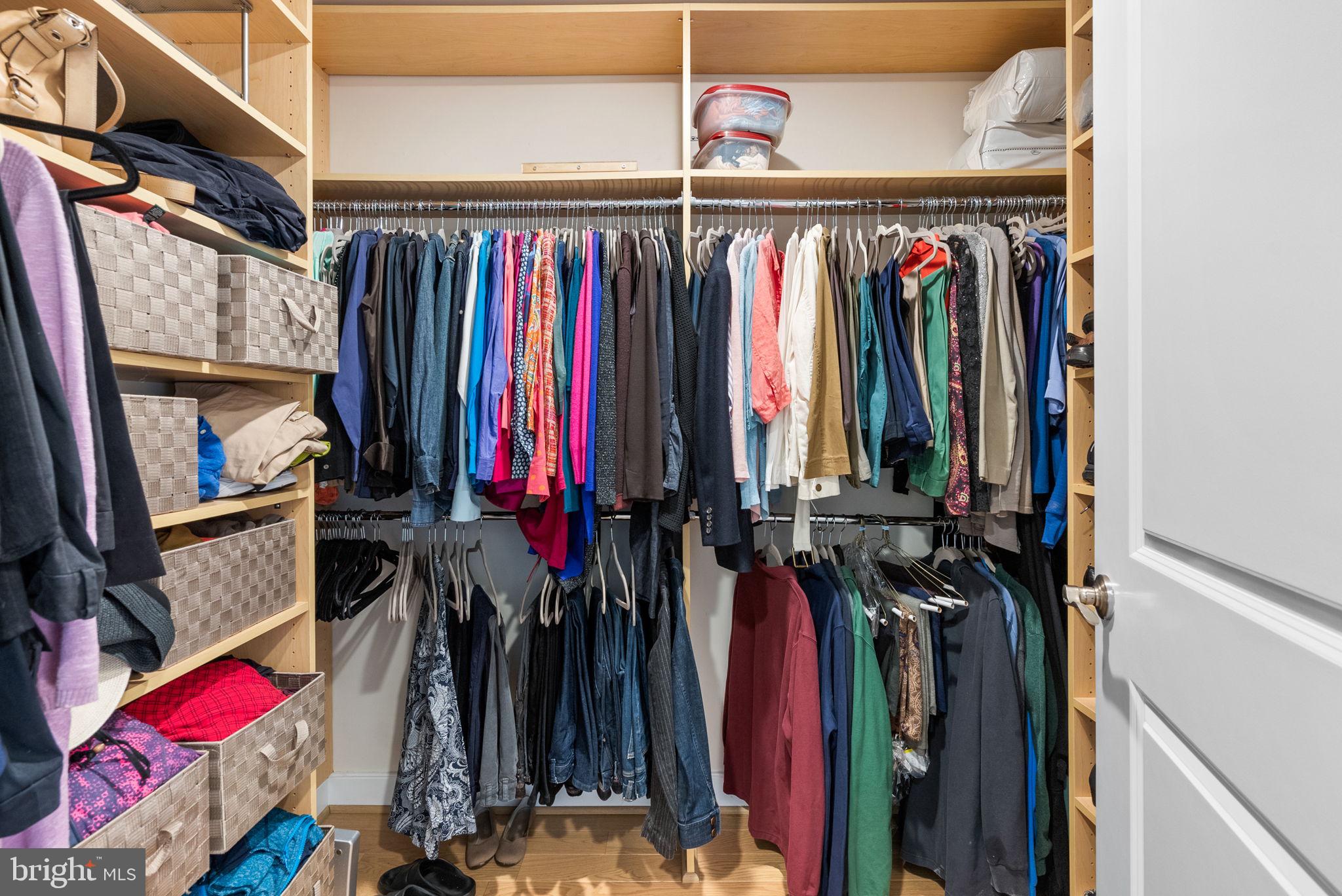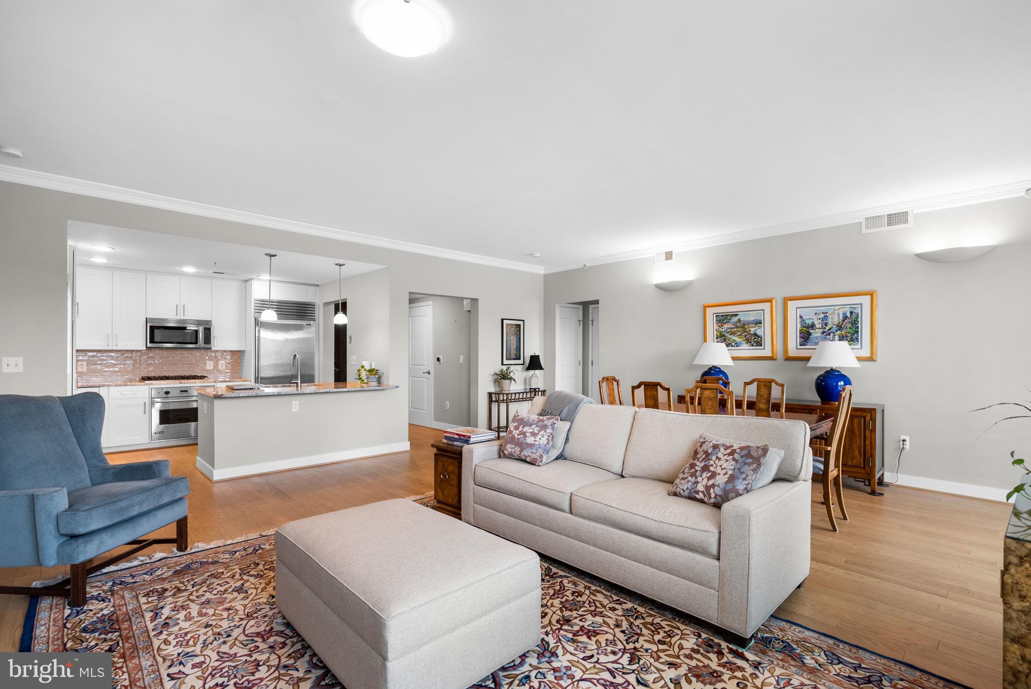 Bright and stylishly renovated, this residence is nestled in the highly desirable South Building of Park Potomac. The home boasts newly installed 5" hardwood floors, a modern kitchen with updated cabinetry and quartz countertops, and a luxurious primary bathroom with a spa-like ambiance. Upon entering, you'll find a foyer with access to a guest powder room. The elegant living room is adorned with large picture windows with custom blinds and a decorative electric fireplace and mantle. Enjoy your morning coffee at the breakfast bar. Additional features include ample closet space, a walk-in laundry room, and custom-built-ins.