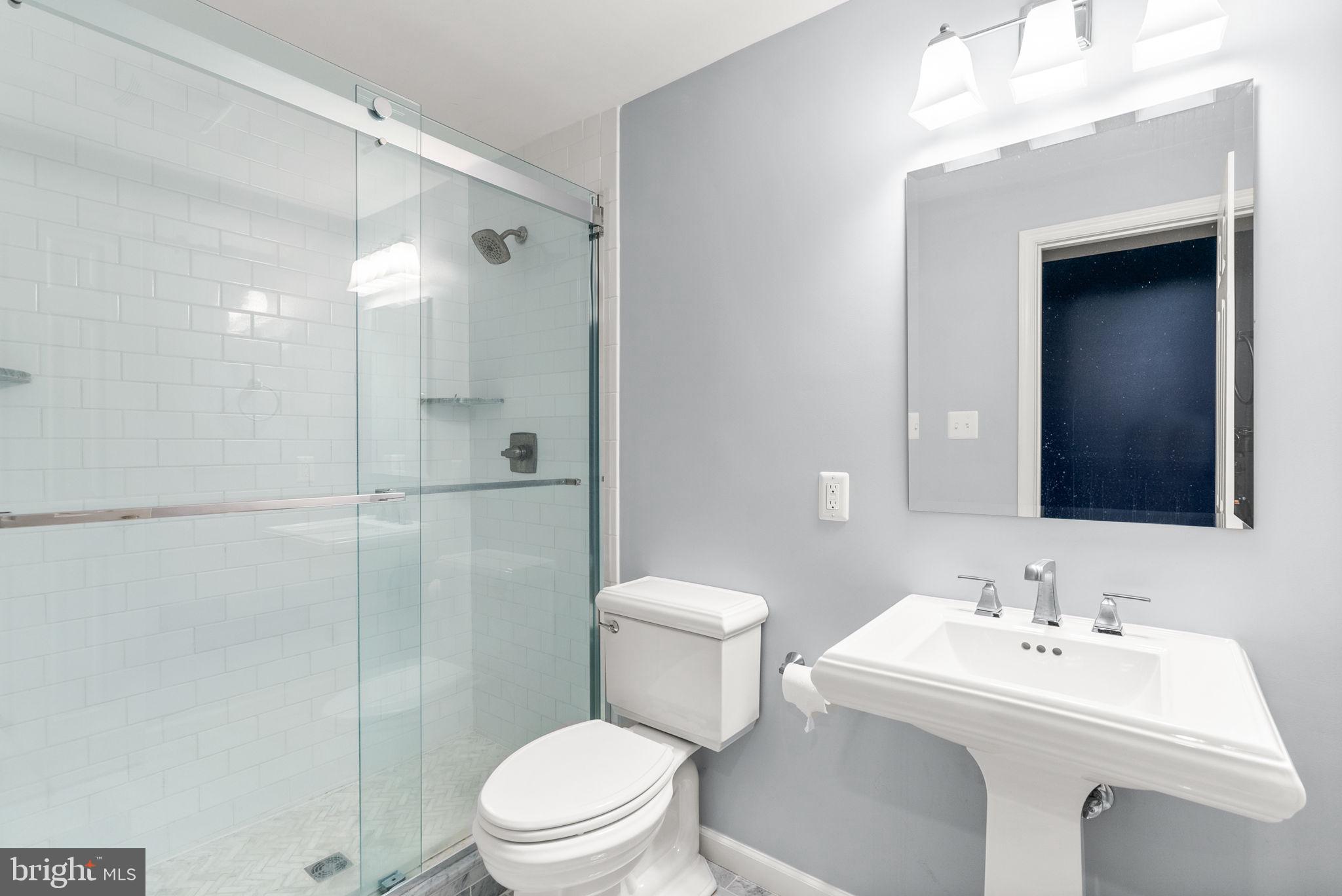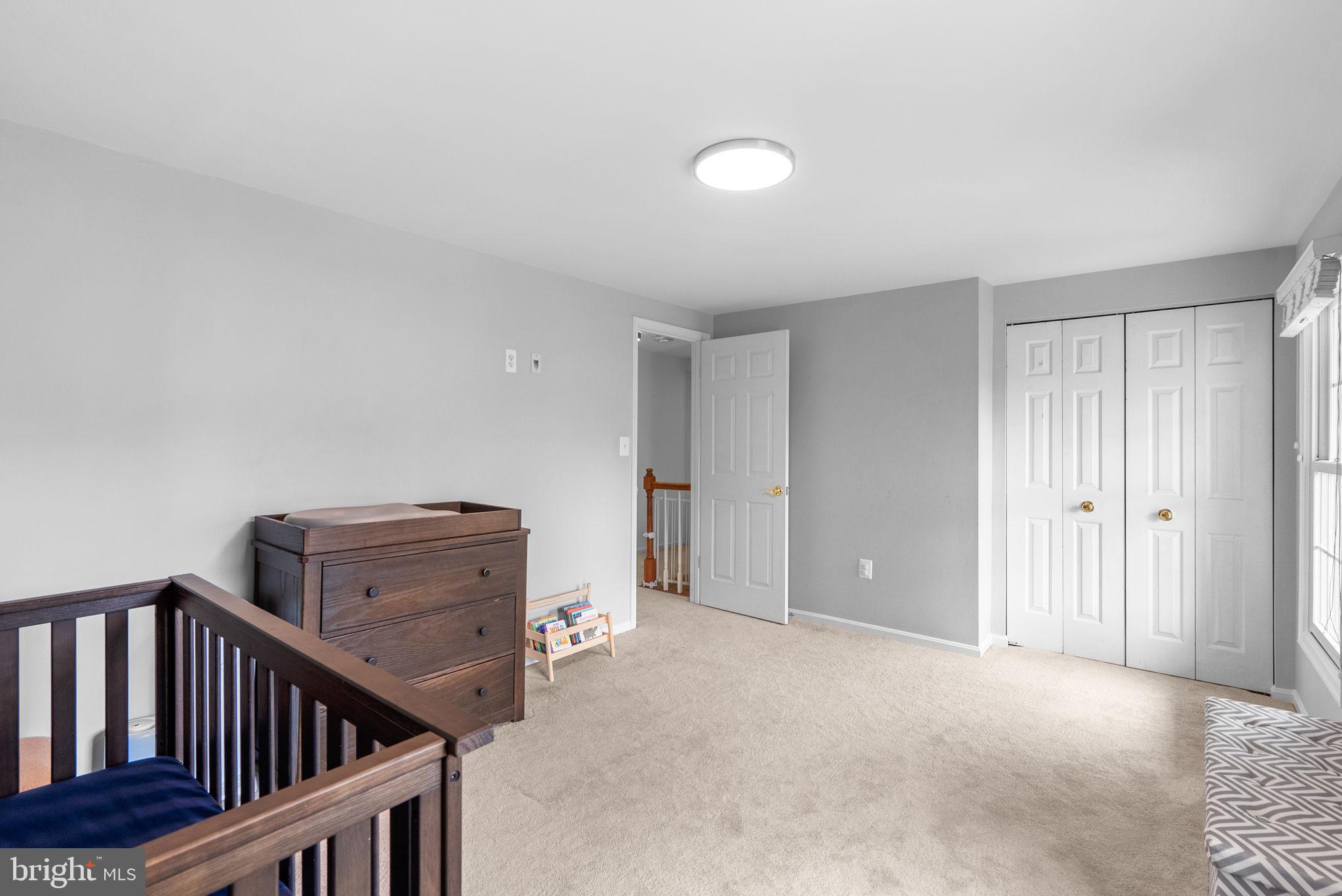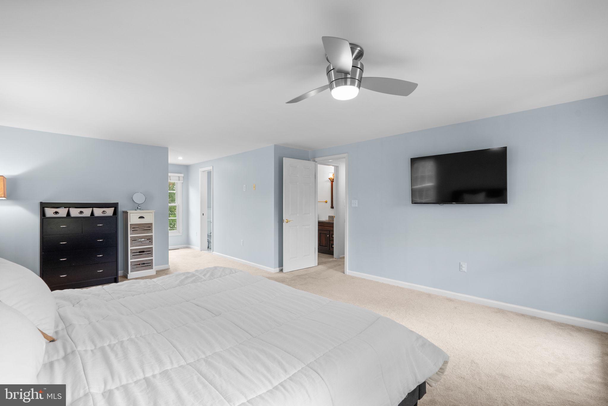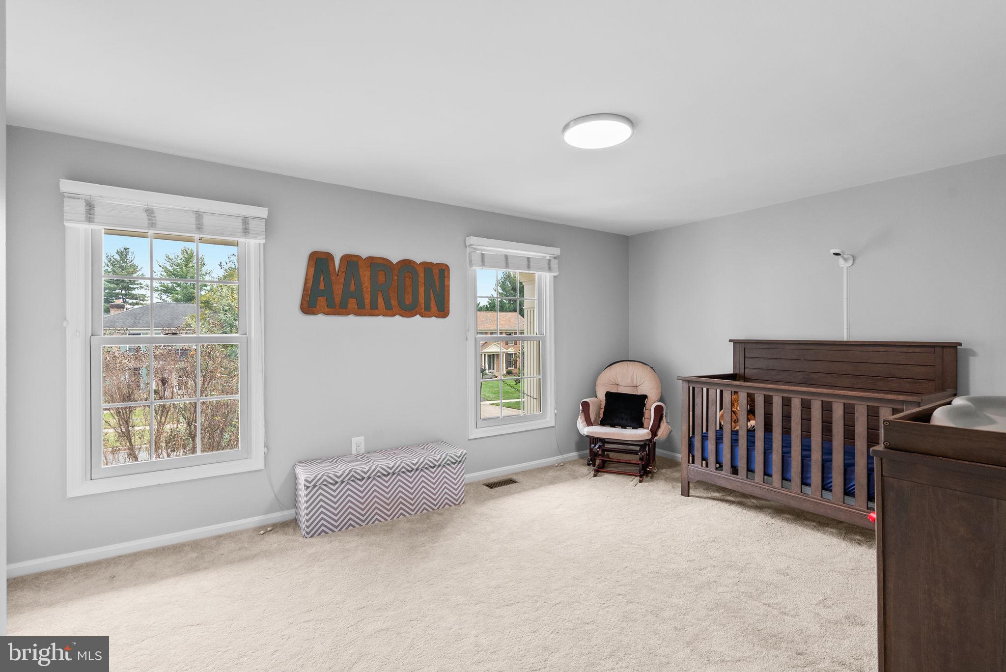 Upstairs, the luxurious primary suite offers a spacious walk-in closet and a renovated en-suite bath with dual vanities, granite countertop, and a custom shower with a glass enclosure. Three additional generously sized bedrooms, all with upgraded carpeting, provide comfortable accommodations. A well-appointed hall bathroom with a tub-shower combination and granite vanity completes the upper level.