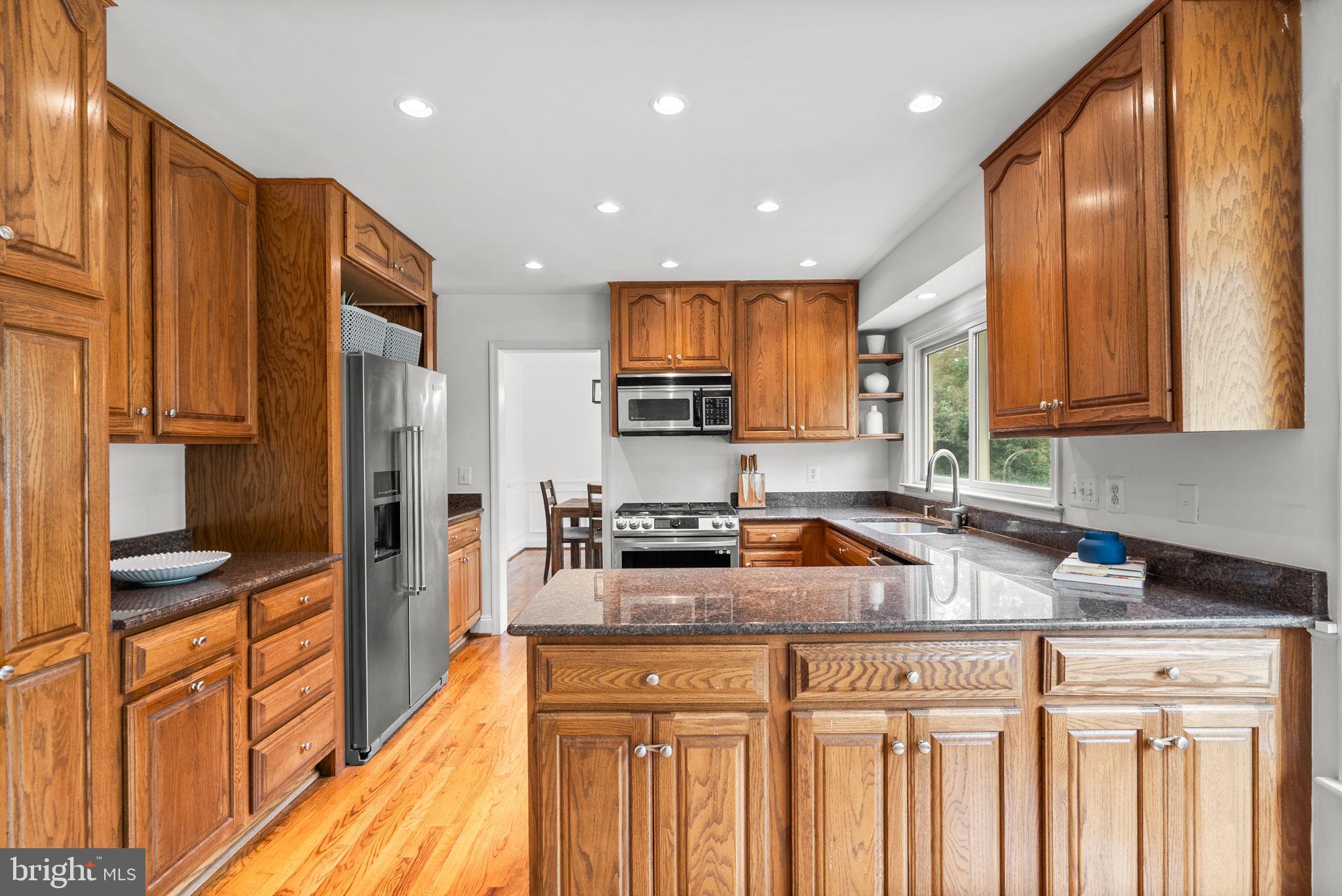 The reimagined kitchen is a chef's delight, showcasing custom cherry cabinetry, granite countertops, stainless steel appliances, a pantry, and extensive recessed lighting. A cozy breakfast room with a bay window and stylish lighting provides the perfect spot for casual dining. The inviting family room features a wood-burning fireplace with stone surround, crown molding, and double sliding doors that open to an expansive custom Trex deck and a sensational fenced-in yard--an ideal setting for relaxation and entertaining.