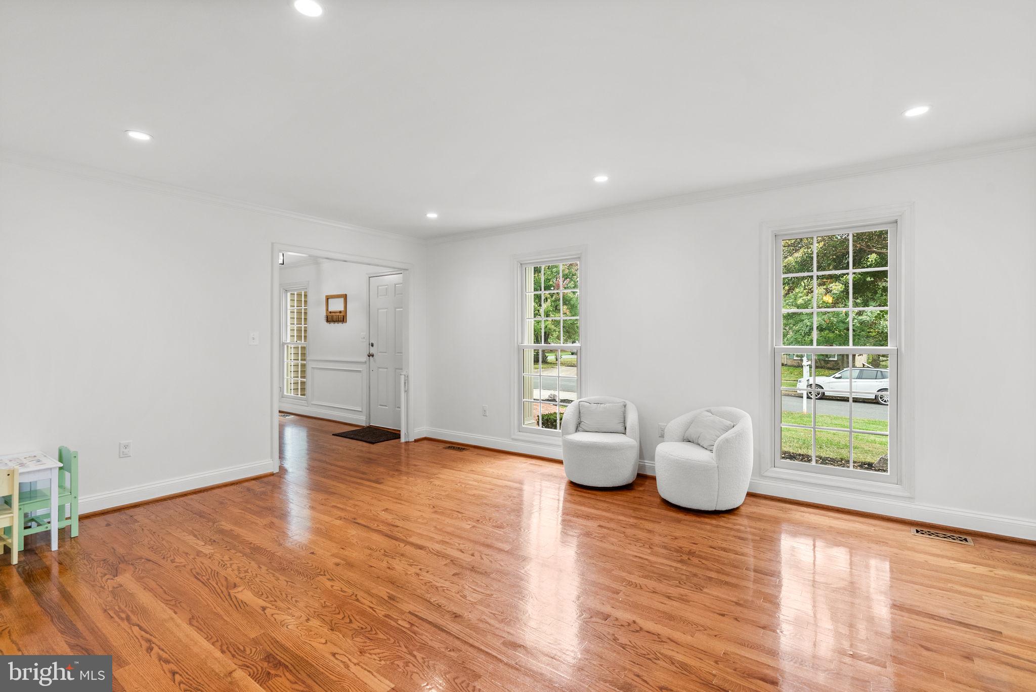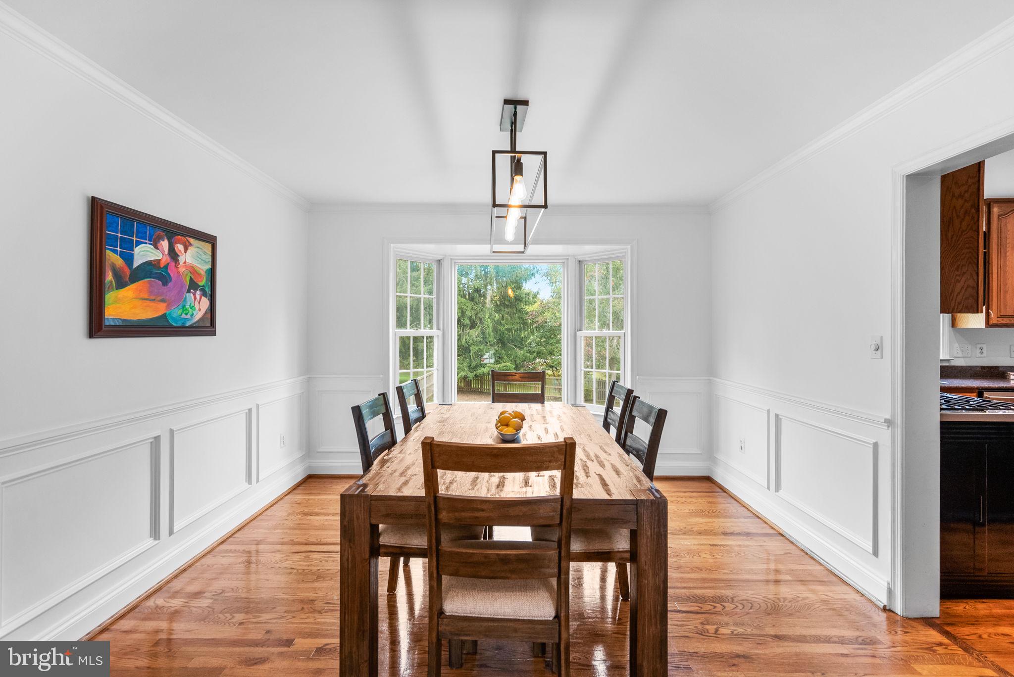 Situated on a meticulously maintained and private fenced-in lot this beautifully updated home blends classic charm with modern convenience, offering spacious, light-filled living areas throughout. A gracious foyer with crown molding, decorative lighting, and hardwood floors set the tone for the elegance found within. The expansive living room features sun-drenched windows, while the formal dining room is highlighted by a bay window, decorative chandelier, and ornamental molding.