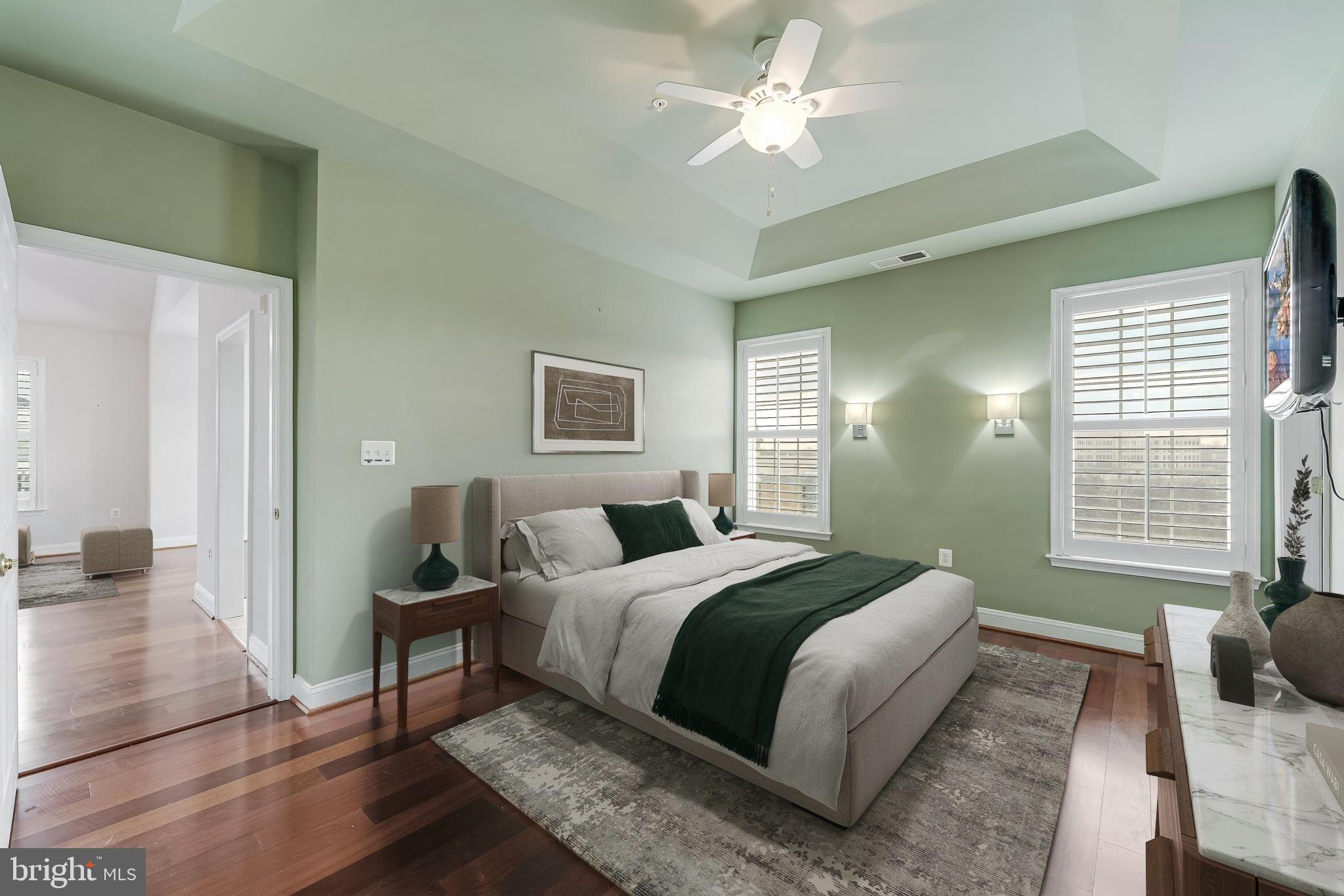 This rarely available luxury penthouse in the heart of sought-after King Farm is a true gem! Step into the inviting foyer, where gleaming hardwood floors lead you into a sun-drenched, expansive living room. Featuring a dramatic vaulted ceiling, a lighted ceiling fan, and an adjoining dining room with rich hardwood floors, this space is perfect for relaxing or entertaining.