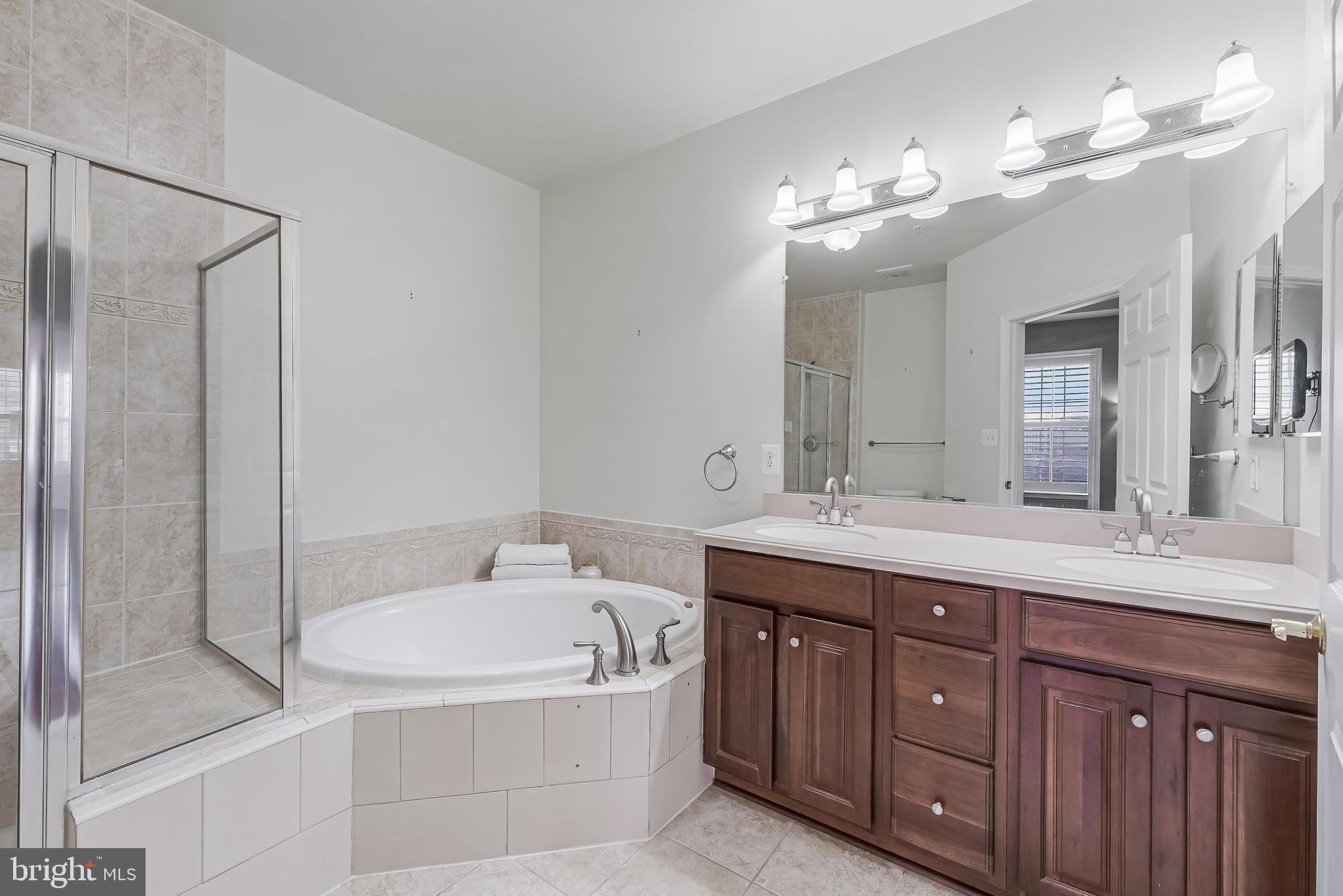 The generously sized primary suite is a private retreat, complete with a luxurious ensuite bathroom and a walk-in closet outfitted with custom organizers. The second bedroom suite offers plenty of privacy, a custom closet, and its own ensuite full bathroom. For culinary enthusiasts, the chef's kitchen is a dream, boasting 42" custom cherry cabinetry, granite countertops, recessed and pendant lighting, and a ceramic tile floor. The kitchen opens to a bright breakfast room, surrounded by windows that flood the space with natural light.