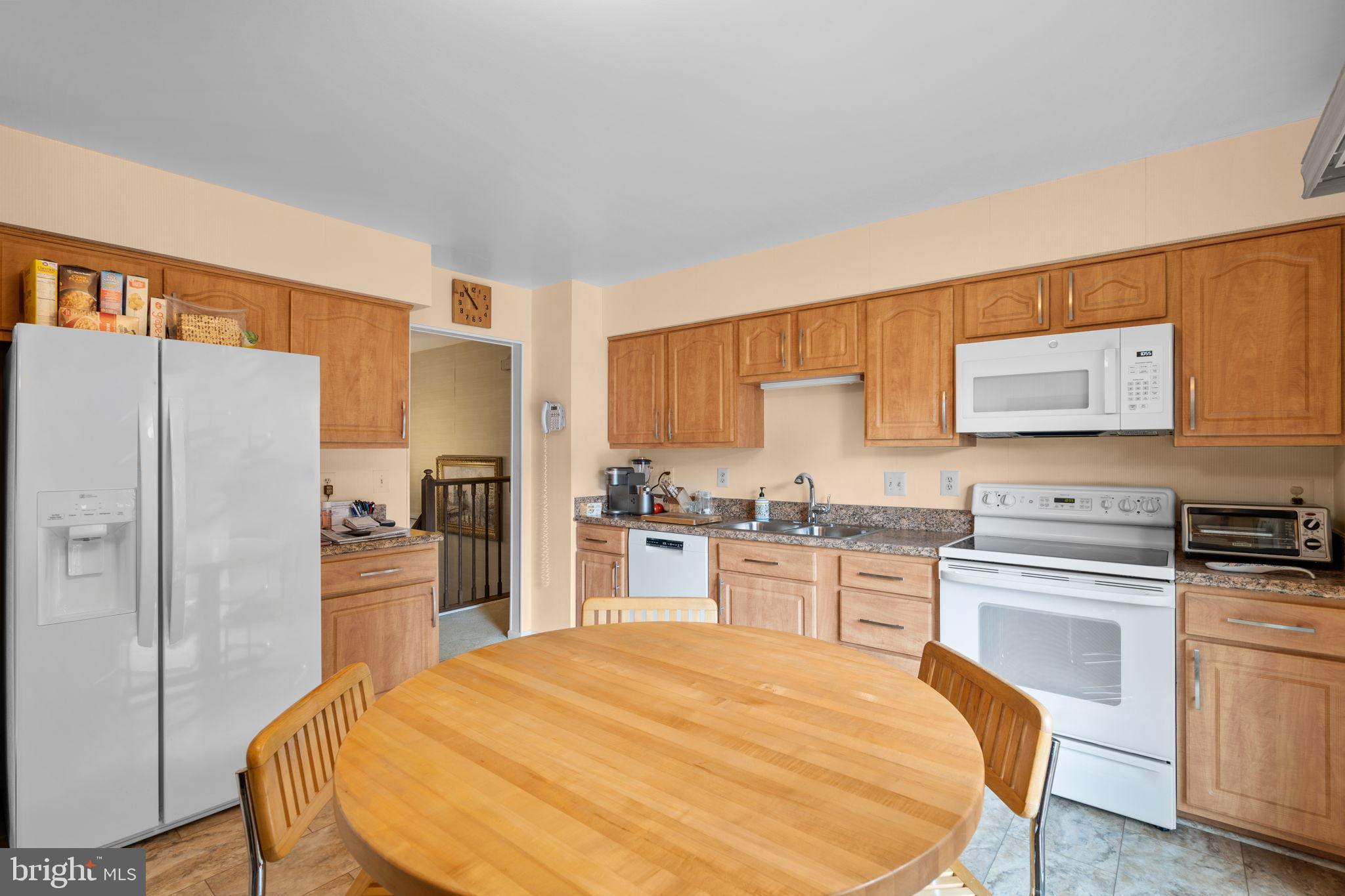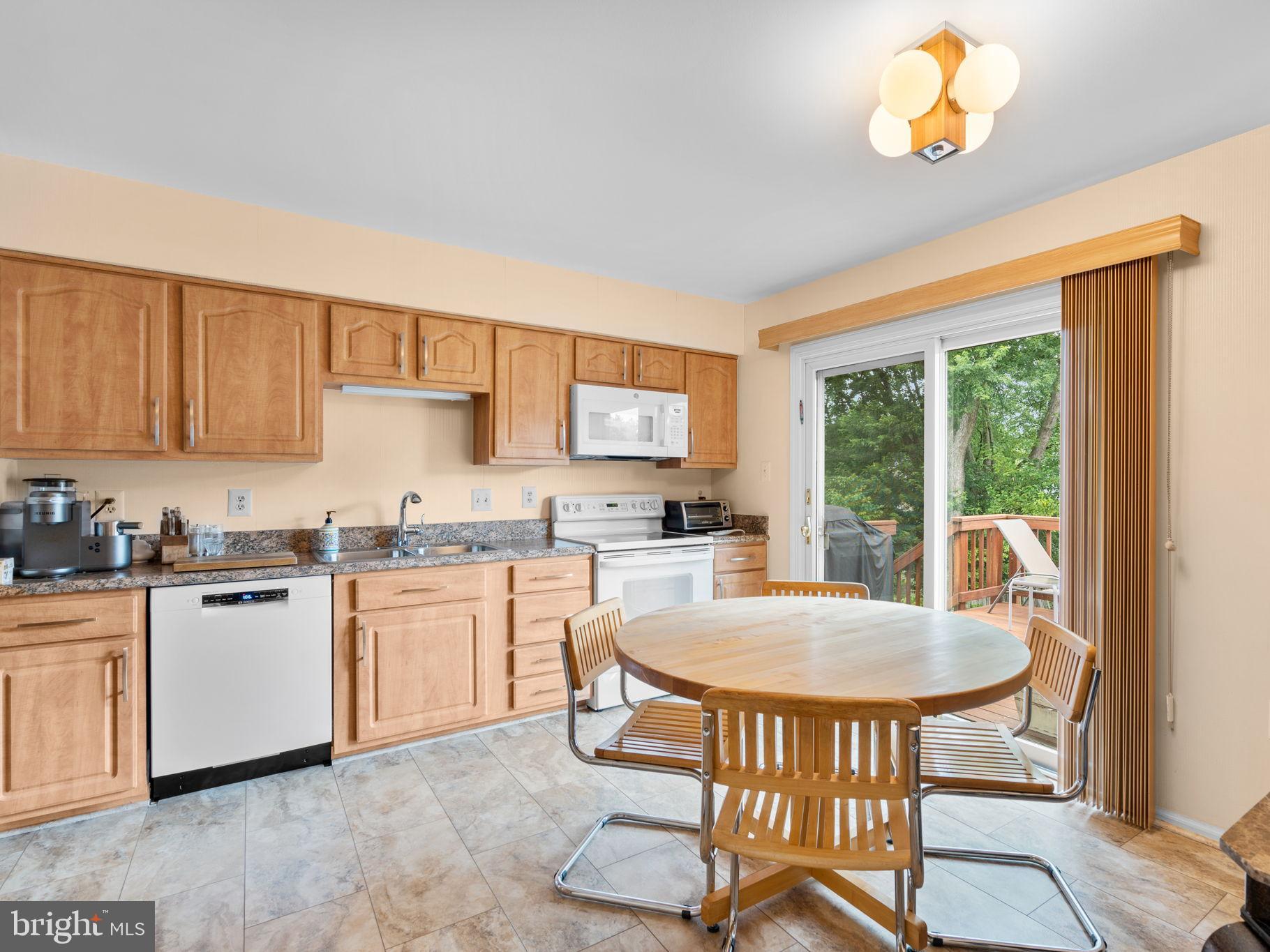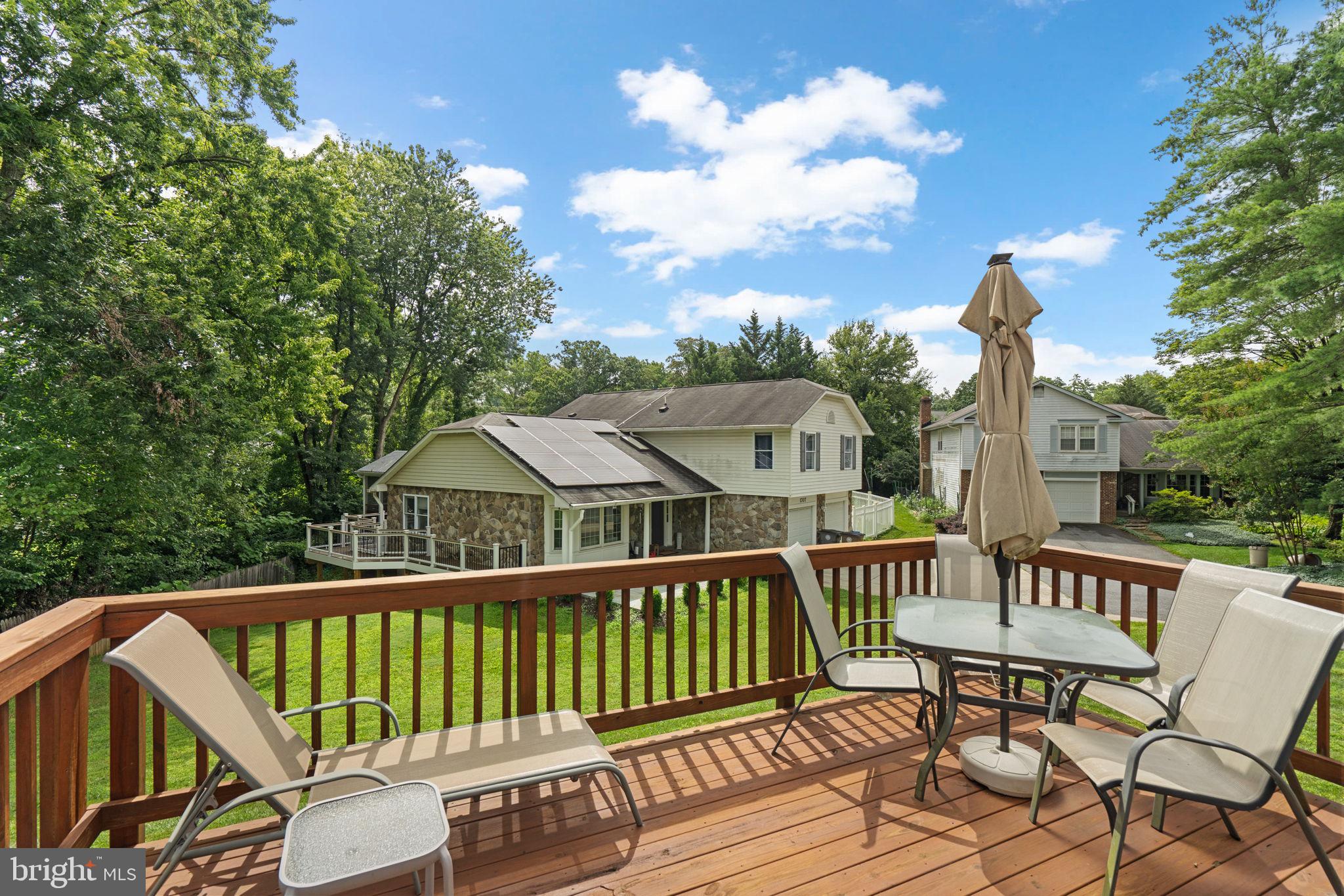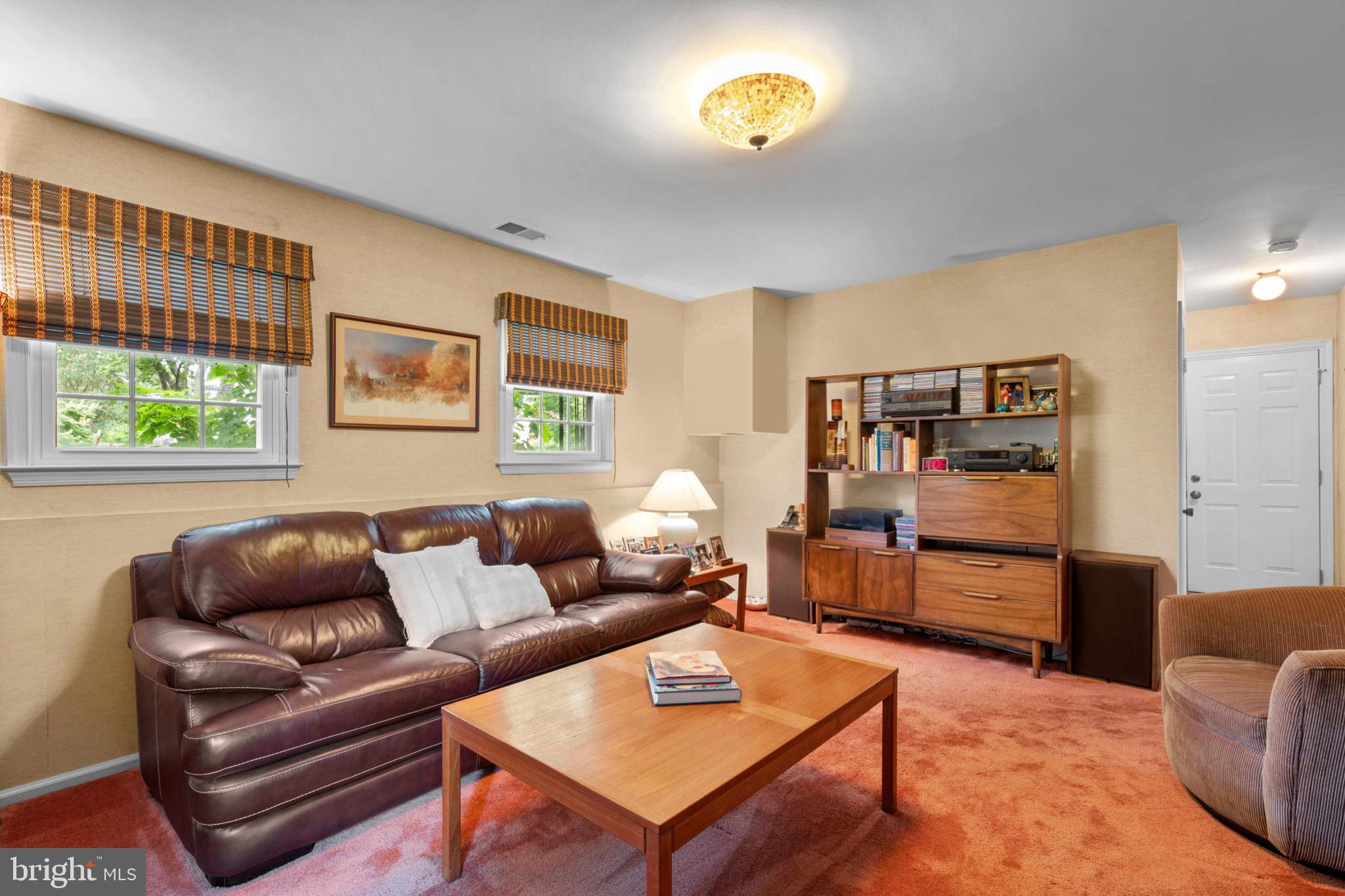 Welcome to 1709 Glastonberry Rd, a spacious multi-level home offering light-filled interiors, thoughtful updates, and a versatile floor plan. A welcoming foyer with slate flooring, coat closet, and decorative chandelier leads to an elegant living room with sun-filled replacement windows, decorative curtains, and wall-to-wall carpeting, alongside a formal dining room with a brass chandelier and matching window treatments. The remodeled table-space kitchen features a Spectra electric range, GE microwave, Bosch dishwasher, LG side-by-side refrigerator/freezer with ice dispenser, stainless dual sink, designer Formica countertops, pantry, luxury vinyl flooring, and sliding door access to a custom deck. Upstairs, the primary bedroom offers a double closet, custom window treatments, and an en suite bath with ceramic tile shower, while two additional bedrooms each feature generous closets, decorative curtains, and plush carpet. The hall full bath includes a ceramic tile tub/shower and decorative vanity. The expansive lower-level family room boasts a wood-burning fireplace with brick hearth and mantle, along with a laundry closet, powder room, fourth bedroom or office, multiple storage areas, and access to the two-car garage. Combining classic charm with modern conveniences, this home is perfect for both comfortable everyday living and stylish entertaining.