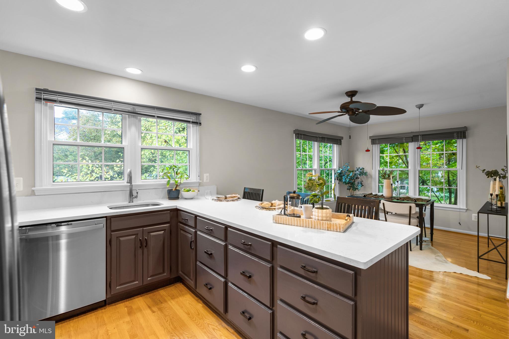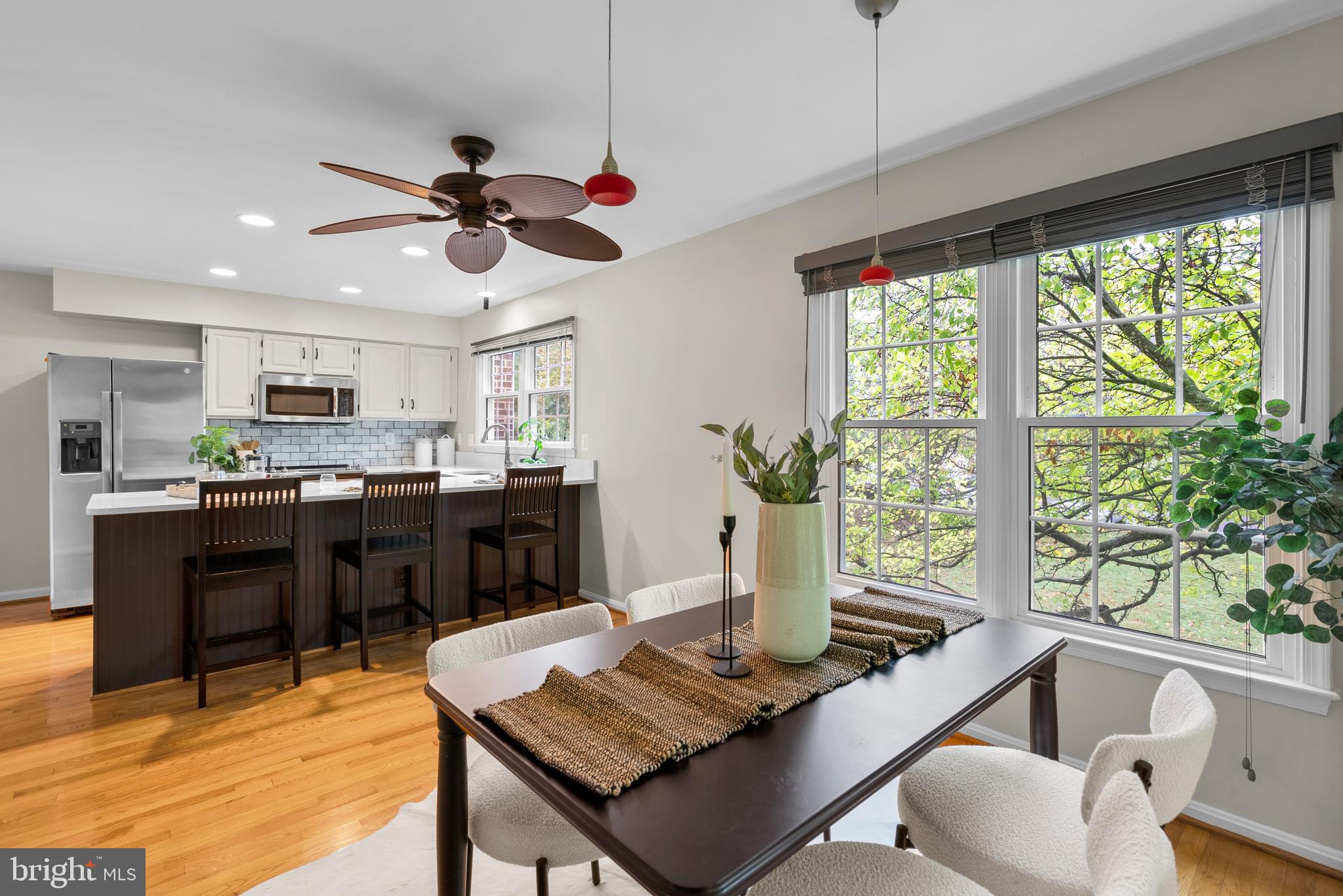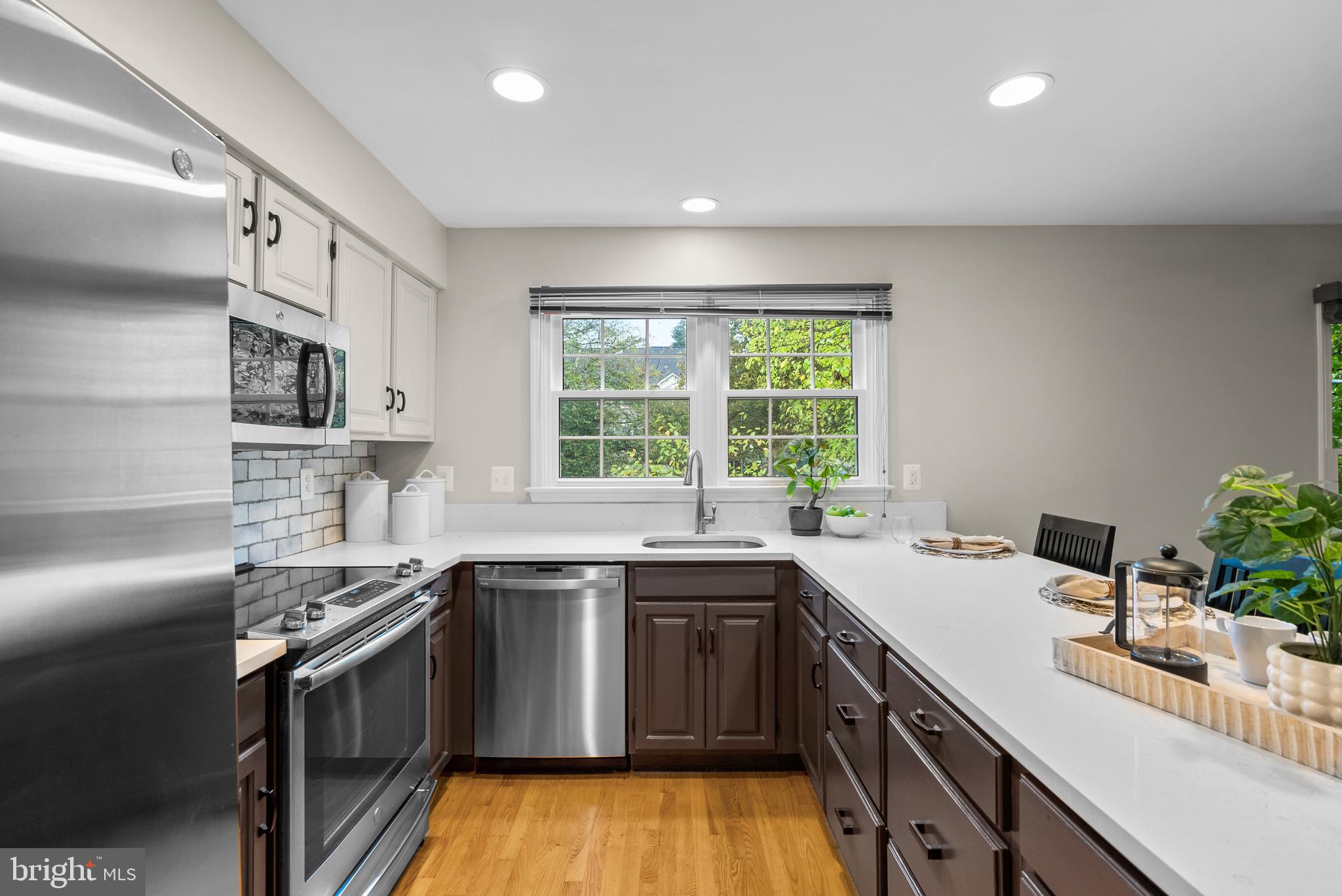 At its heart, the updated kitchen shines with quartz counters, professionally painted cabinets in a custom designer hue, stainless steel appliances, and a generous breakfast bar that flows into a dining area wrapped in greenery -- perfect for both everyday living and effortless entertaining.