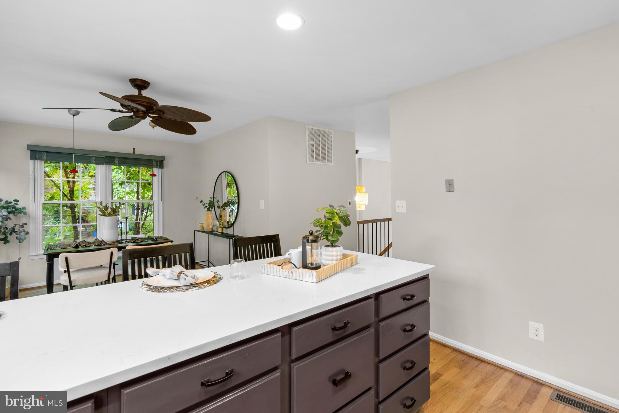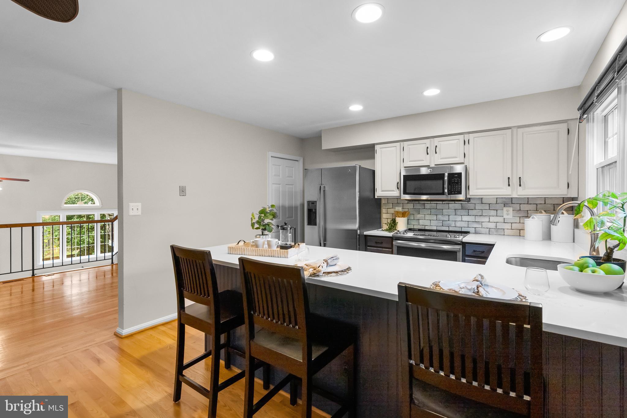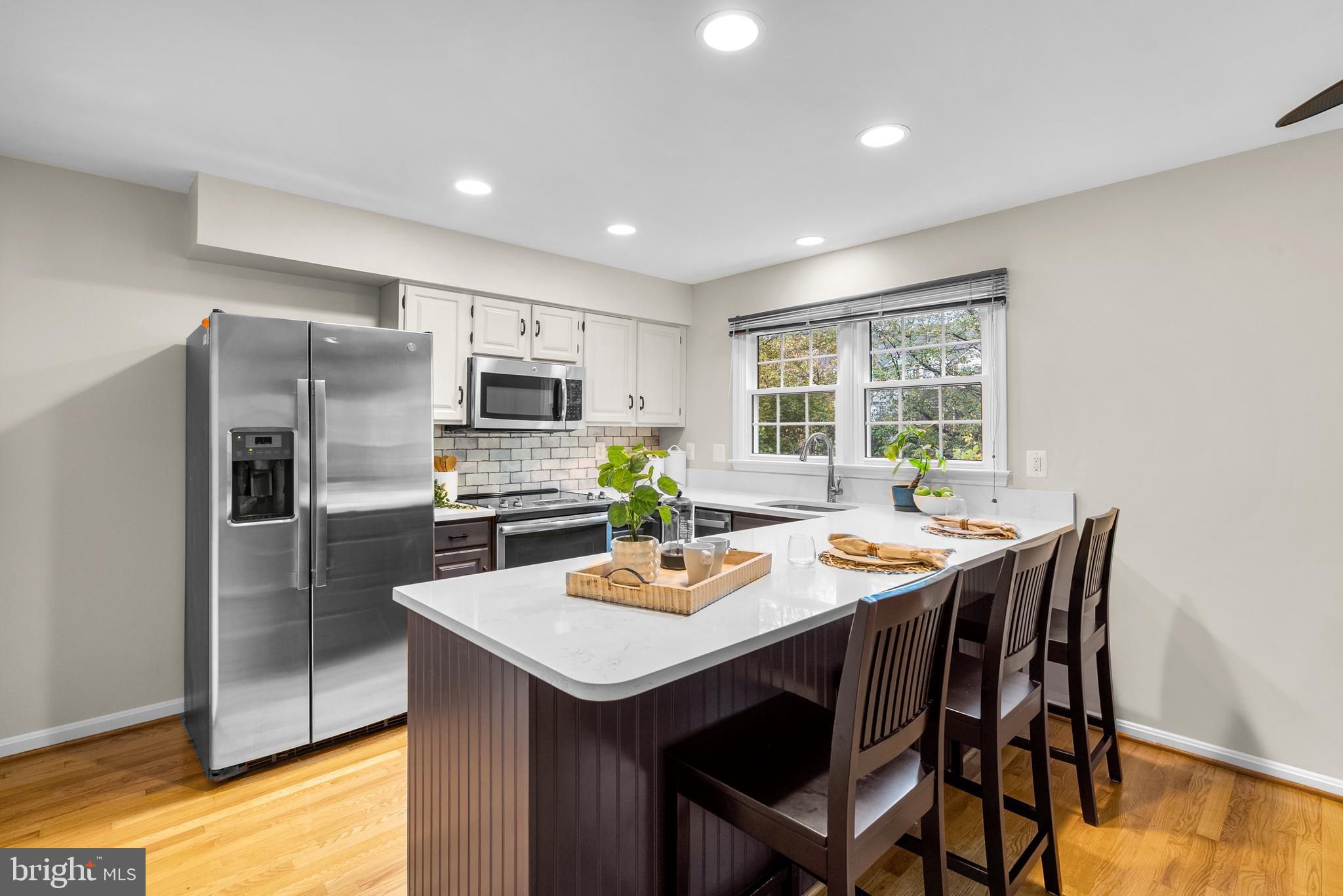 At its heart, the updated kitchen shines with quartz counters, professionally painted cabinets in a custom designer hue, stainless steel appliances, and a generous breakfast bar that flows into a dining area wrapped in greenery -- perfect for both everyday living and effortless entertaining.