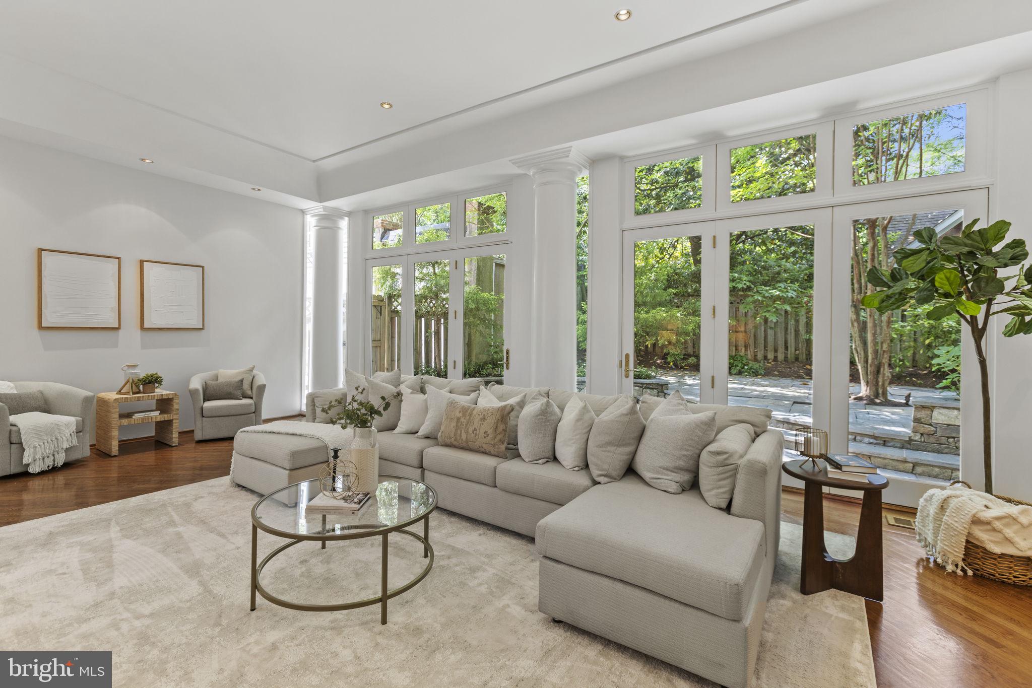 The heart of the home is undoubtedly the great room with it's soaring ceilings, atrium of windows and double french doors leading to the backyard oasis, a private haven for relaxation and entertainment. The stone patio, shaded by mature trees, is perfect for al fresco dining and summer barbecues. The lush lawn and garden beds provide a beautiful setting for outdoor activities and gardening enthusiasts.
