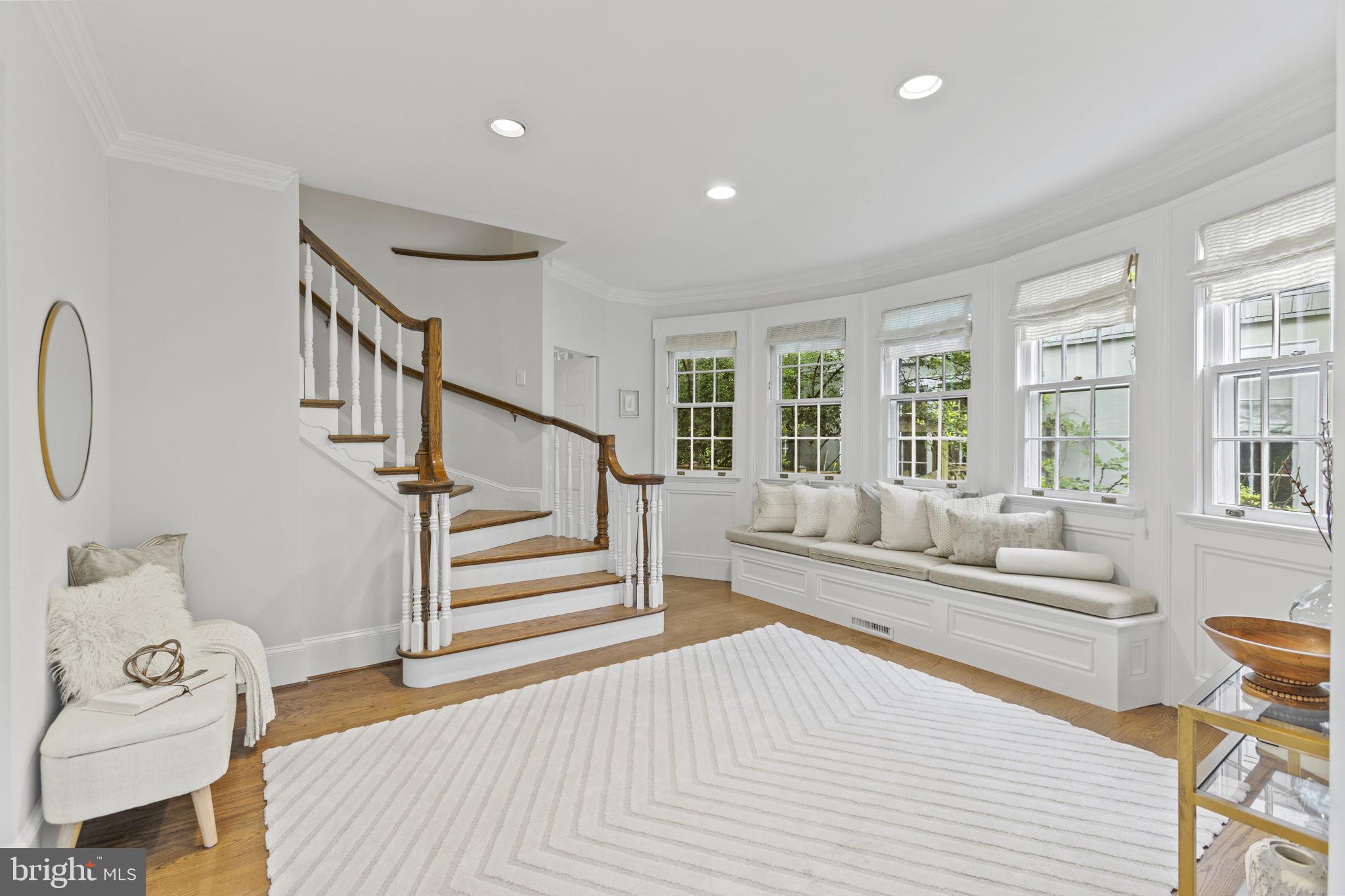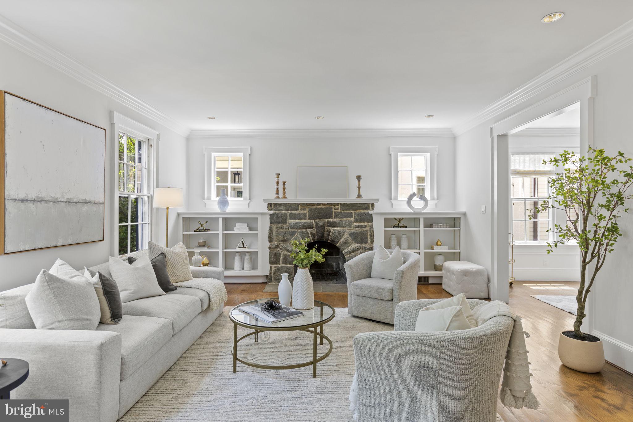 Step inside, and the warm embrace of transitional lines and historic design envelops you. The grand foyer, with its spiraling staircase and built in bench sets the tone for the rest of the home. To your left, the formal living room invites you in with its expansive windows, flooding the space with natural light and offering picturesque views of the surrounding neighborhood. A stately fireplace with surrounding builtins serves as the room's centerpiece.