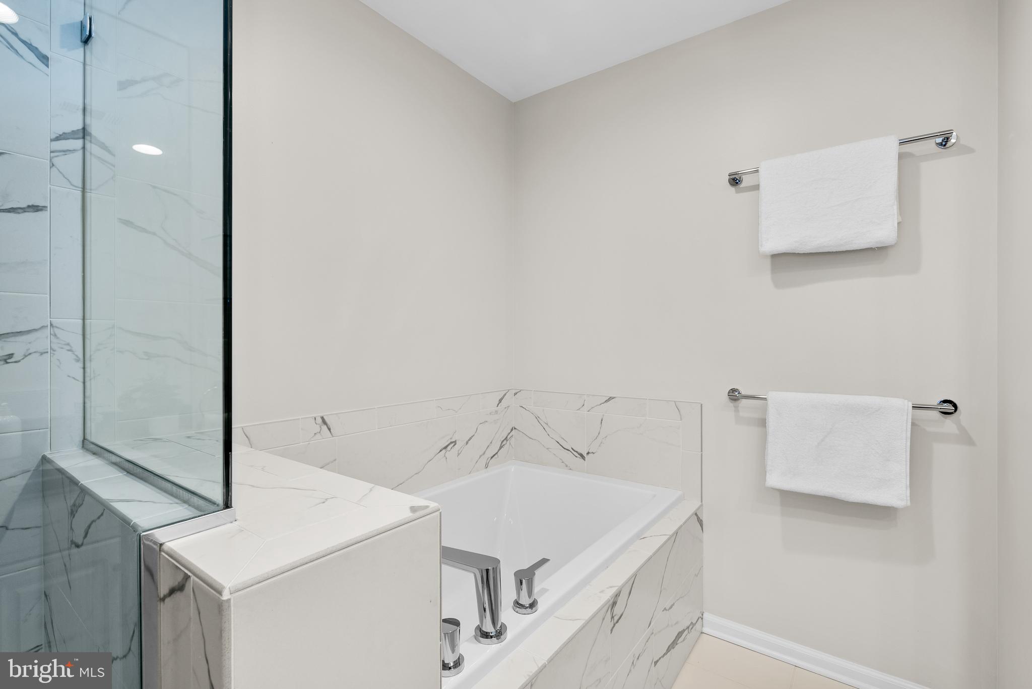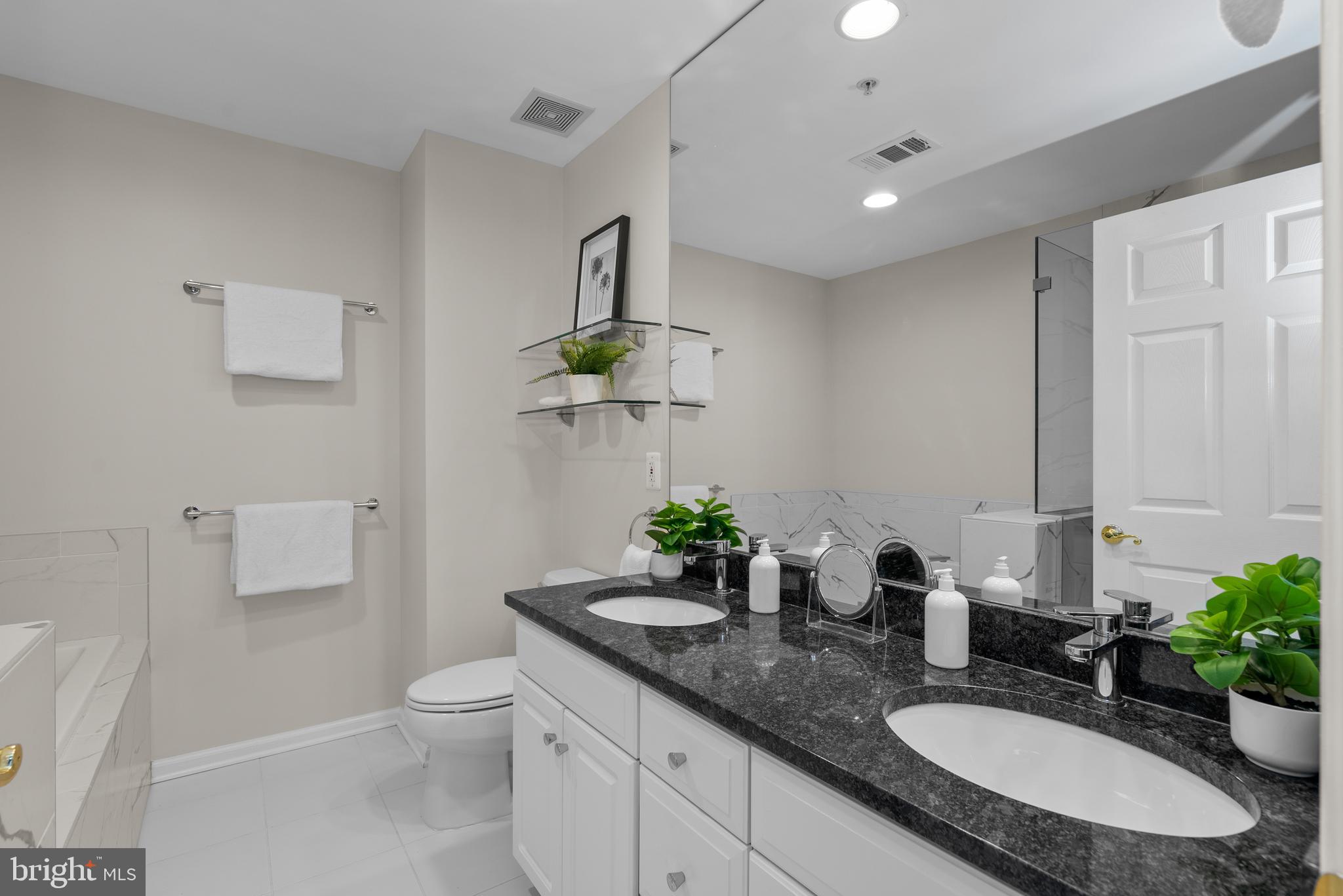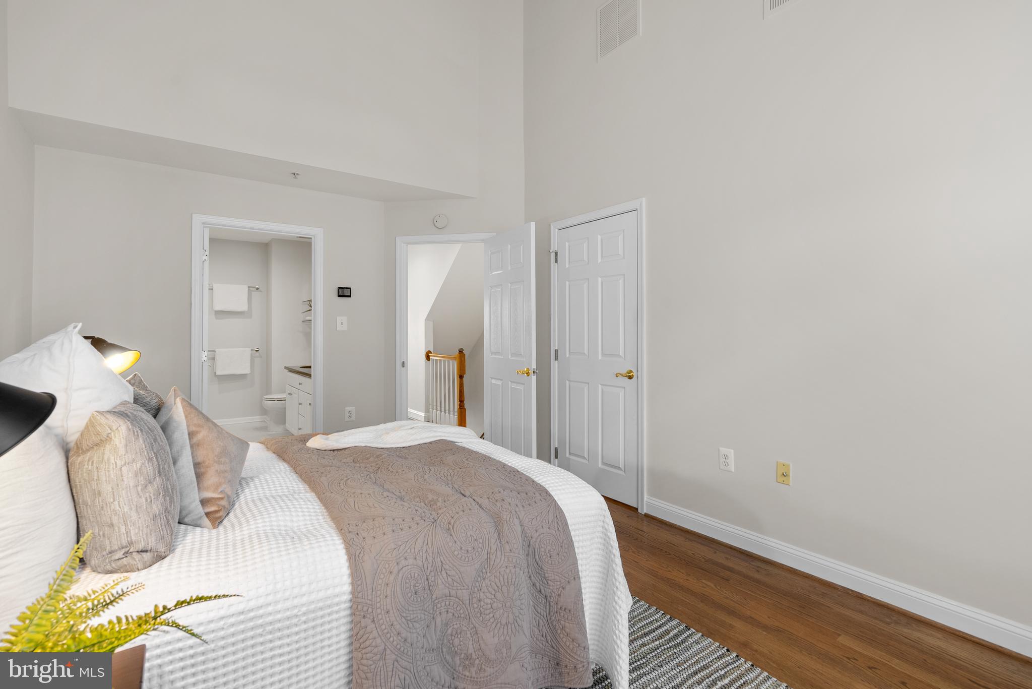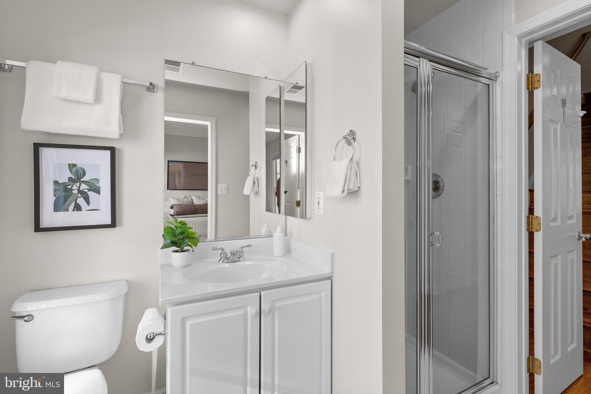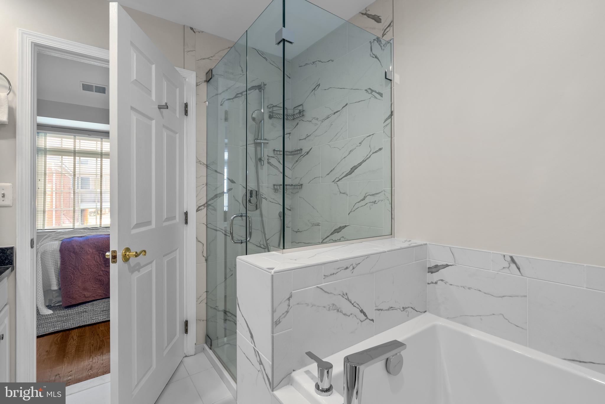 On the third level, the primary suite offers a haven of relaxation. The spa-inspired en-suite bath, complete with elegant finishes, is your personal retreat after a busy day. A spacious walk-in closet ensures everything has its place. A second bedroom on this level, with full bath accessible from both the bedroom and hallway, offers privacy and convenience for guests.
