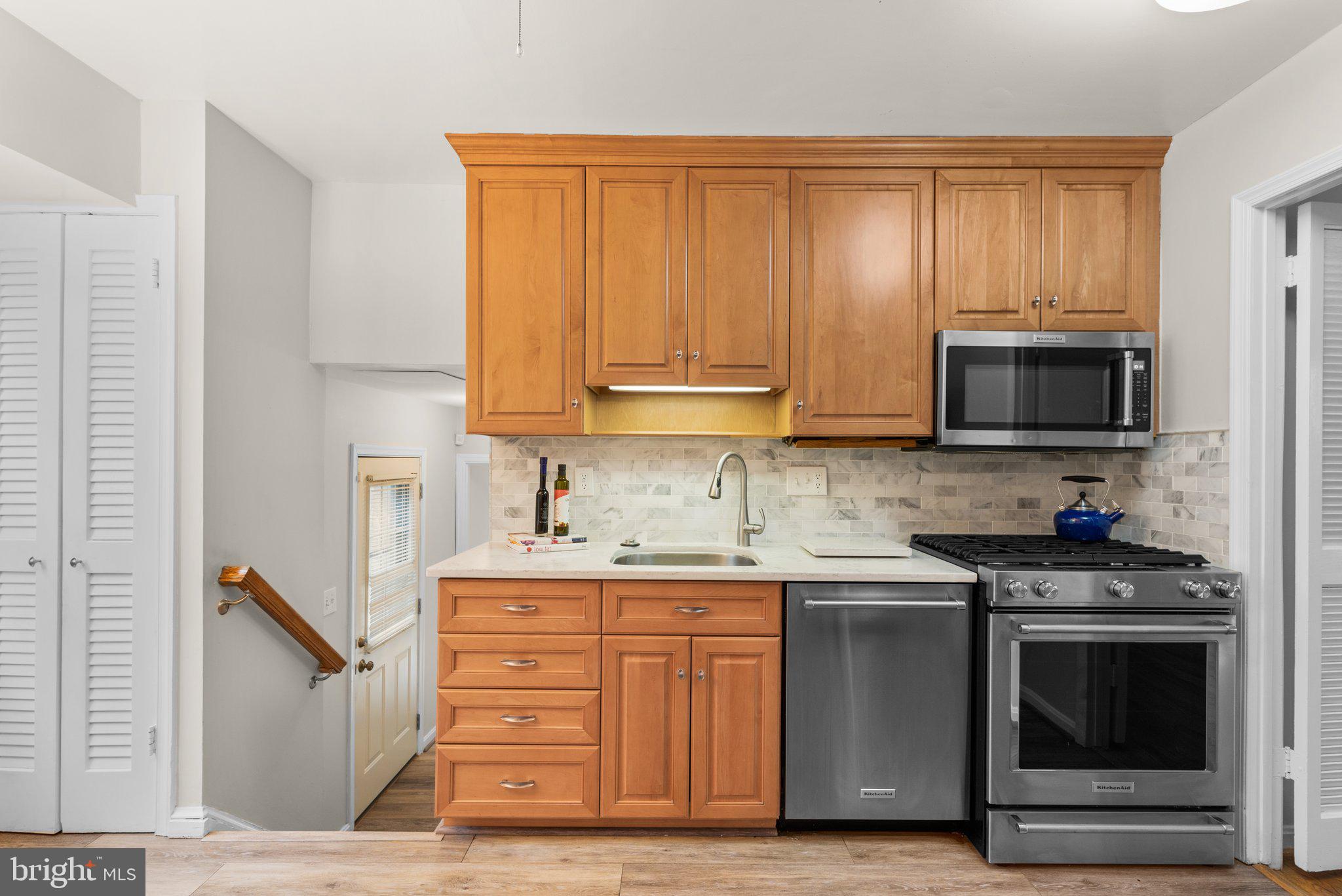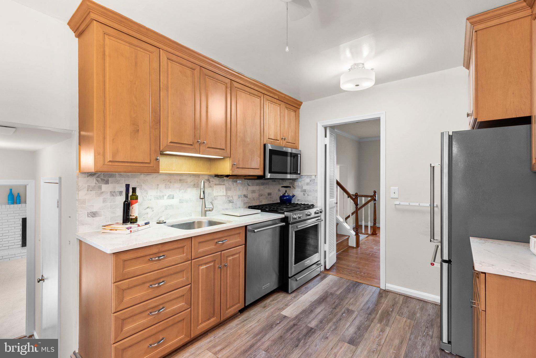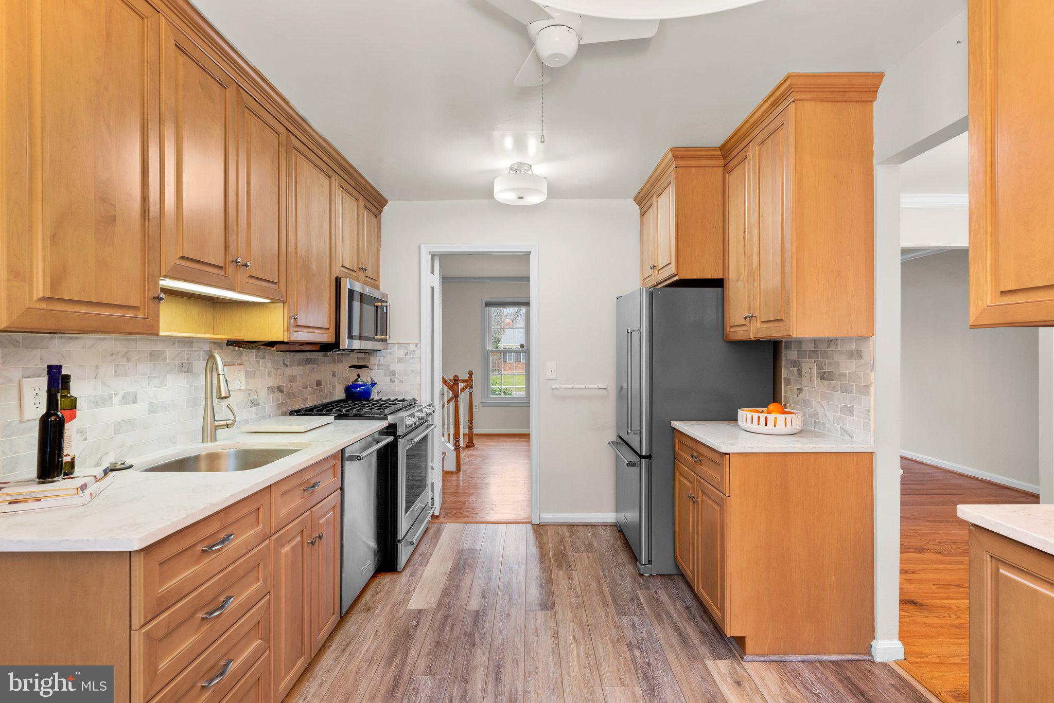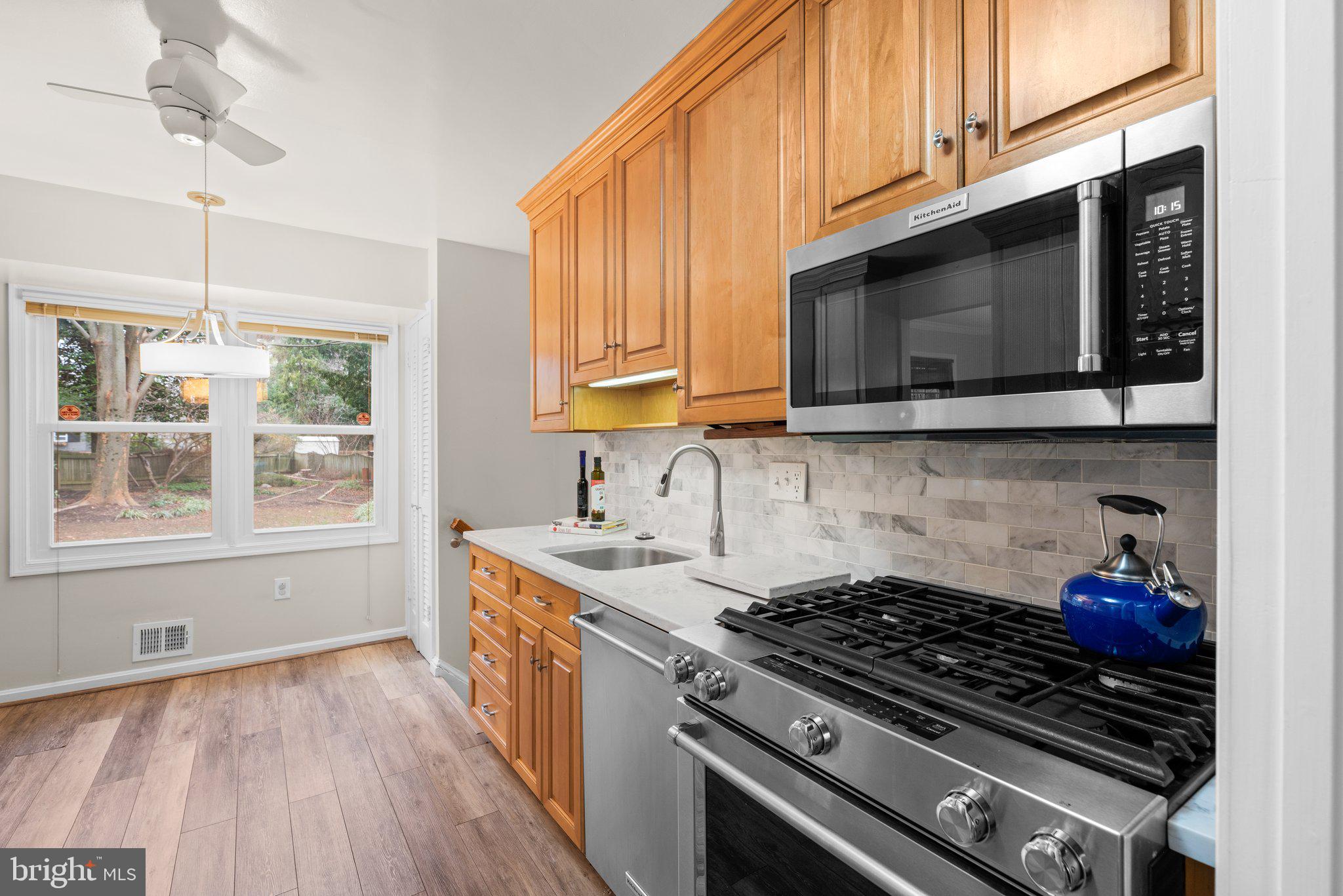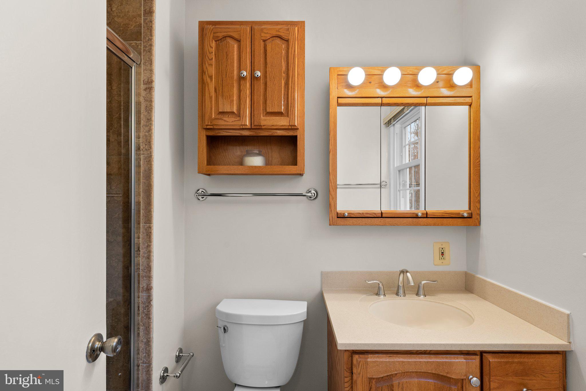 This special home is situated on a magnificent private lot framed by mature trees, specimen plantings, a pond, and flagstone patio. The main level features a gracious foyer with a designer chandelier and ceramic tile floor, a powder room with granite vanity, and a versatile bedroom or den with custom blinds and wall-to-wall carpet. The sun-filled family room boasts a wood-burning fireplace with brick surround and new wall-to-wall carpet, and access to a slate patio. The remodeled kitchen shines with 42-inch maple cabinetry, stainless steel KitchenAid appliances, undercabinet lighting, luxury vinyl flooring, and a pantry. Entertain in style in the elegant dining room with crown molding, chair rail, and a decorative chandelier, or relax in the living room with hardwood floors and custom blinds.Upstairs, the primary suite includes two double closets with custom organizers, a linen closet, and an en suite bath with a tiled shower, glass enclosure, Corian vanity, and ceramic tile floor. Two additional bedrooms offer custom shades, ample closet space, and hardwood floors. The hall bathroom features a tub/shower combo with decorative glass enclosure, Corian vanity, and ceramic tile flooring. The unfinished basement provides ample storage space, a 50-gallon hot water heater (2006), and the furnace (2017). Outside, enjoy the privacy of the slate patio, perfect for entertaining or relaxing.