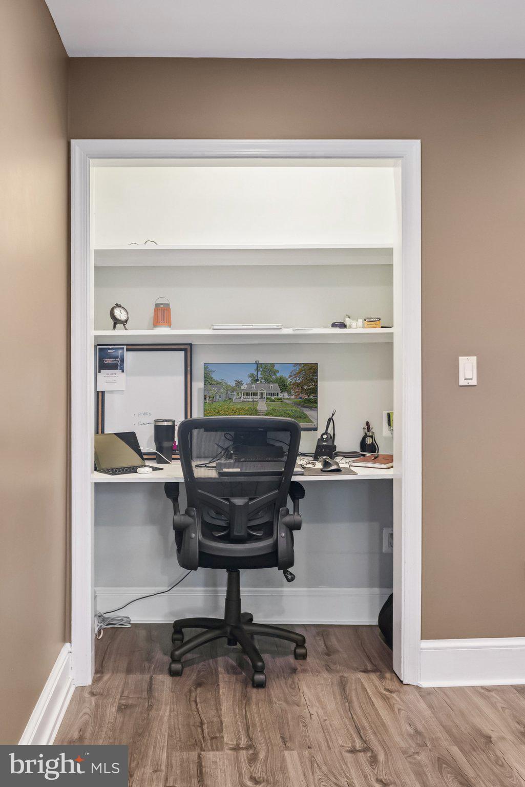 guest bedroom with decorative built-in shelving, plenty of closet space, a cozy home office,