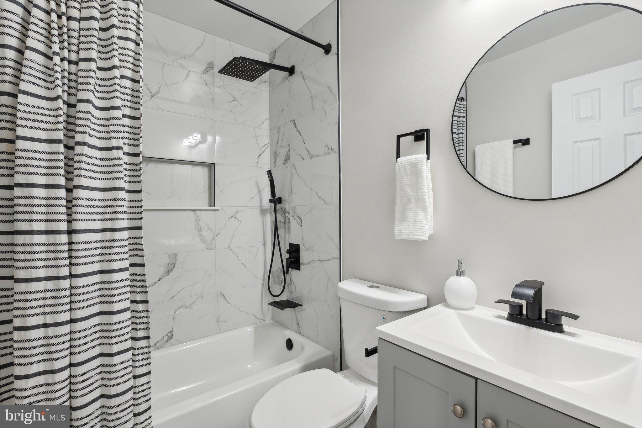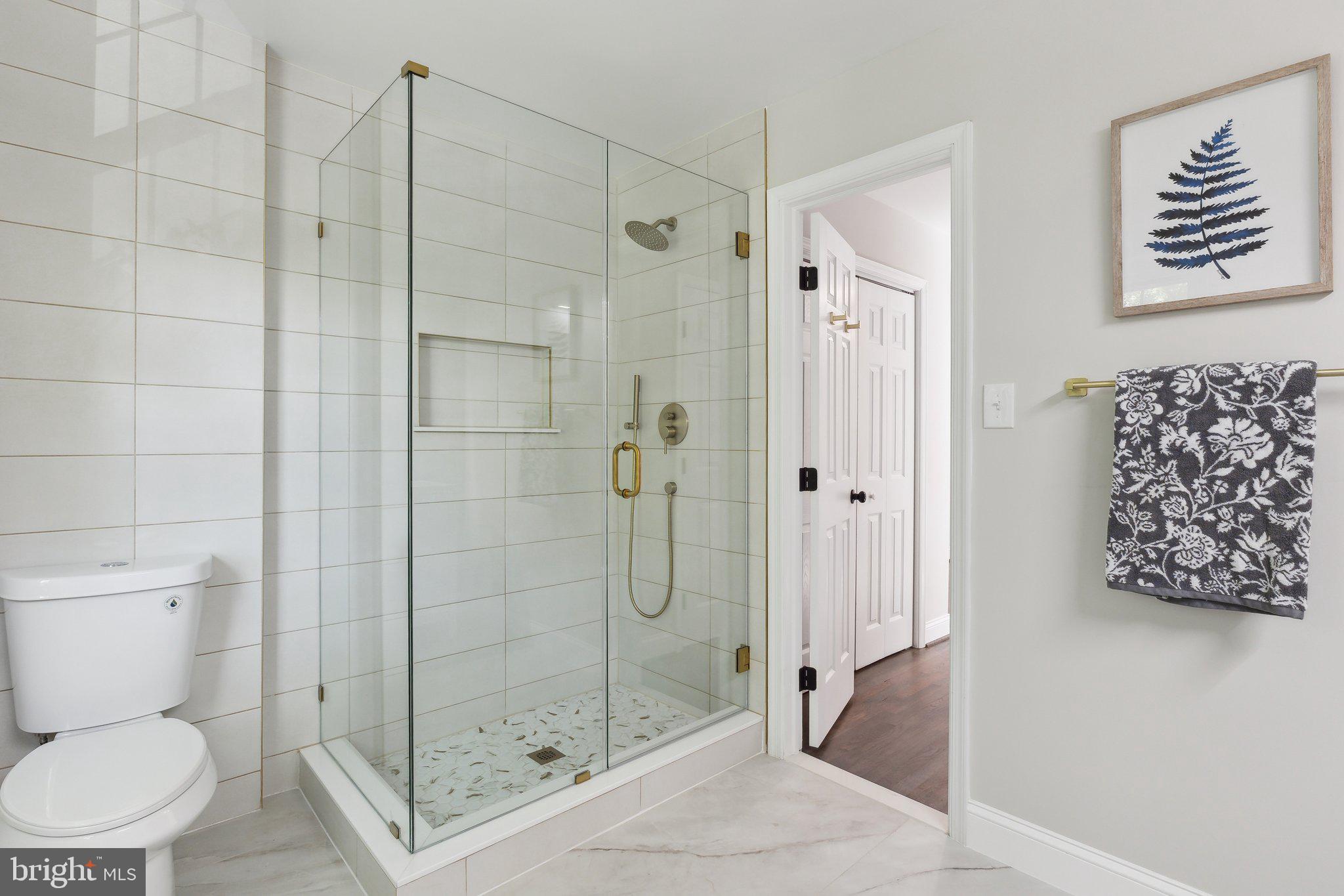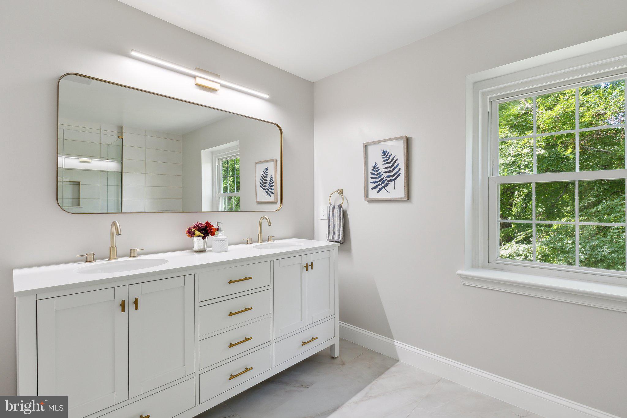 Venture upstairs to discover four spacious bedrooms and two beautifully updated full baths. The primary suite is a true sanctuary, featuring original gorgeous hardwood floors, a walk-in closet, a second closet for all your storage needs, and a luxurious ensuite bath. The tiled shower, double sink vanity with chic gold fixtures and accessories provide a spa-like experience right at home.