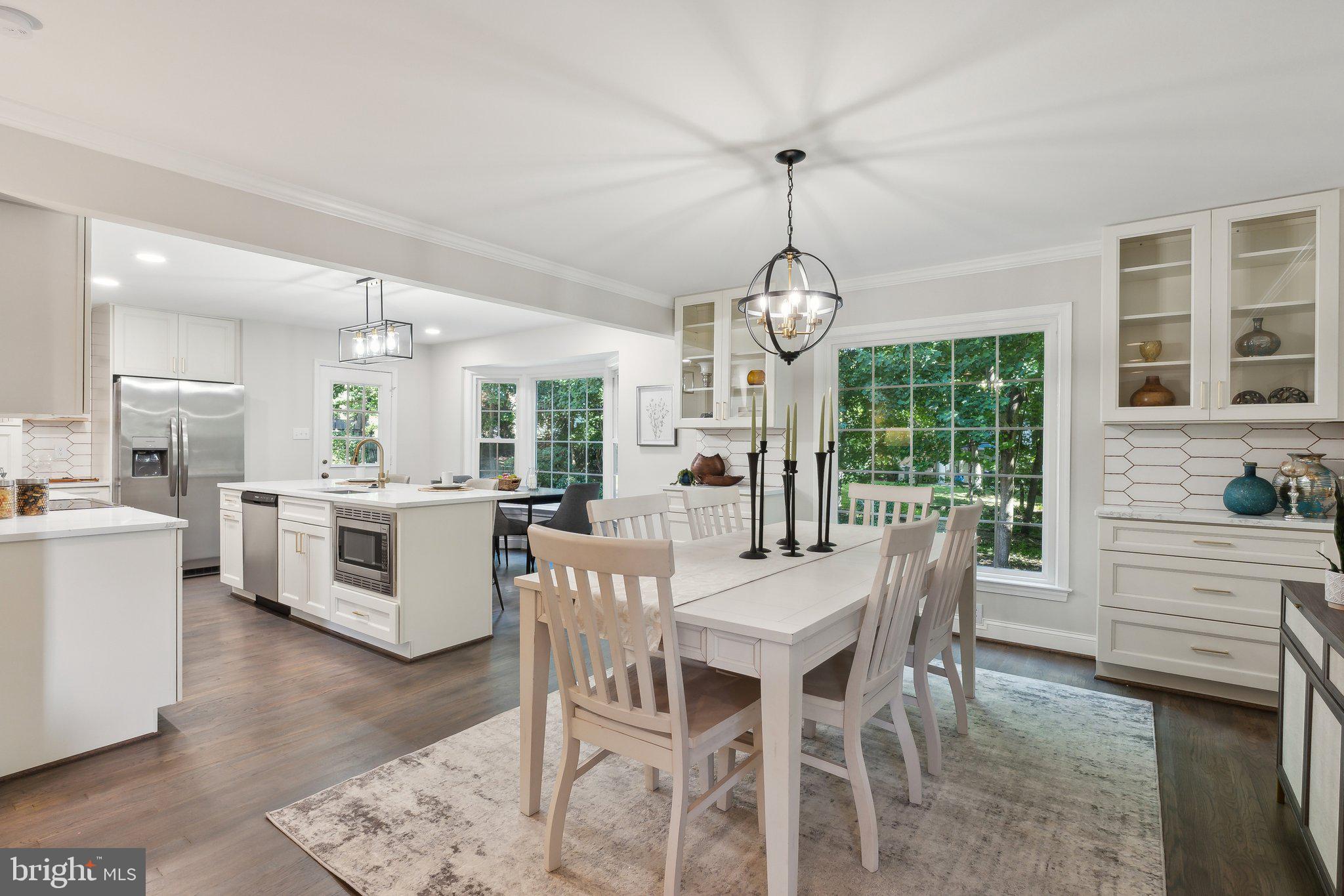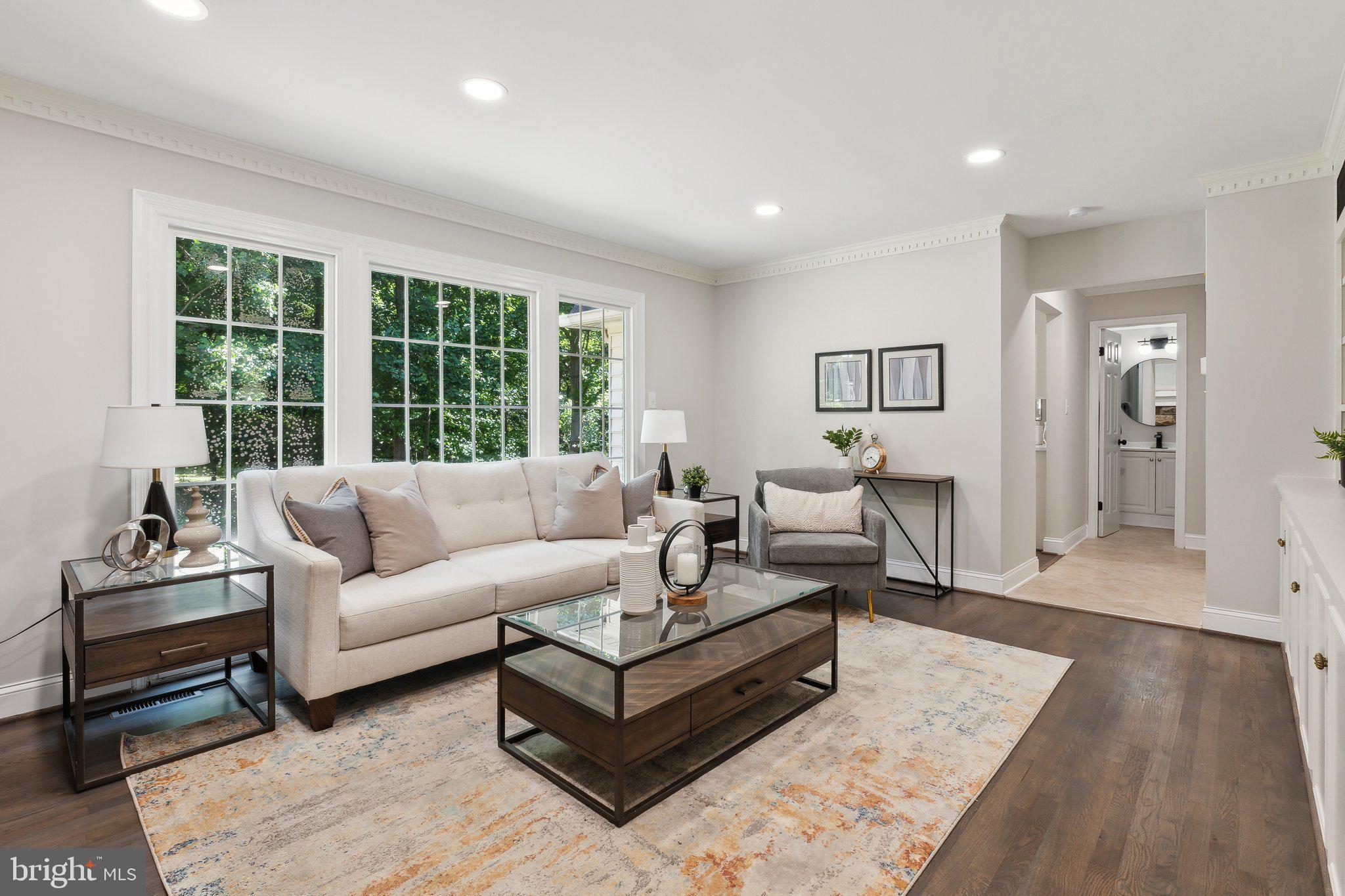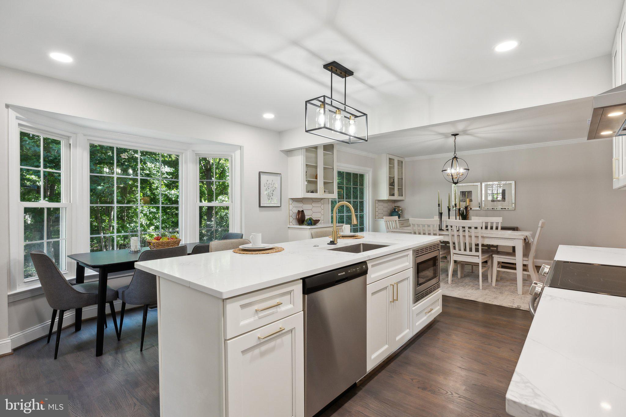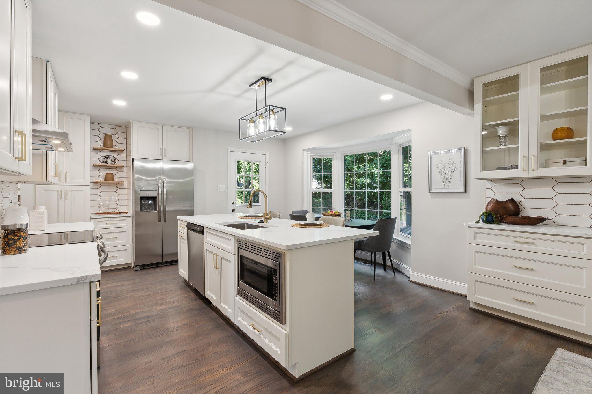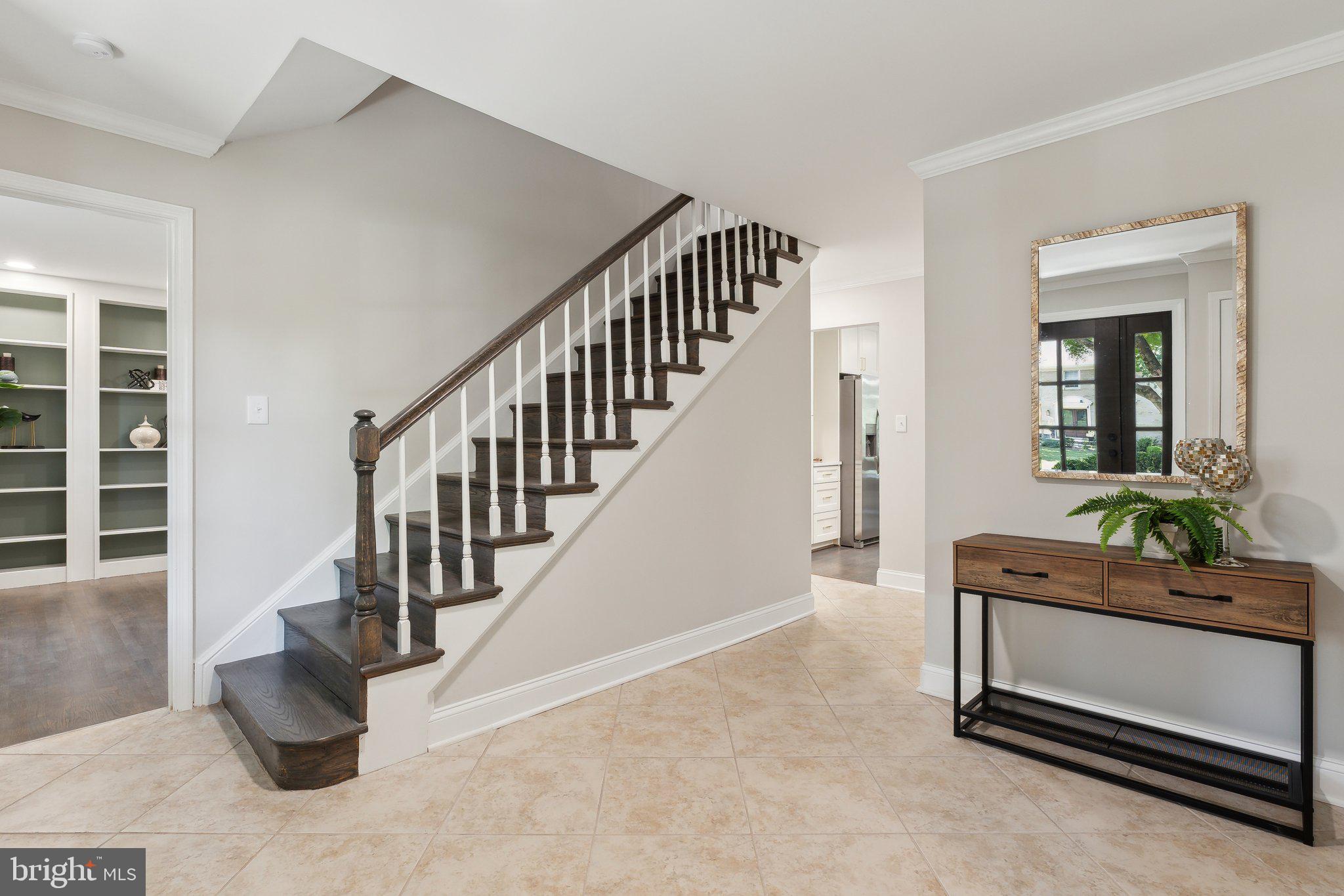 Step inside through the new exterior 3/4 glass door and be greeted by the large and inviting foyer leading into the main living areas. On the main level, you'll find a charming office/library with custom-built bookshelves, perfect for your home office or reading nook. Refinished hardwoods grace the living, dining, kitchen and family rooms on the main. The large and spacious living room offers ample space for entertaining or relaxing and provides a bright and inviting space to gather with family and friends. The dining room showcases beautiful glass-front cabinetry that complements the kitchen's aesthetic. The fully updated kitchen is a chef's paradise, boasting brand-new cabinetry, sleek quartz countertops, and sparkling stainless steel appliances. Whether you're whipping up a gourmet meal or enjoying a casual breakfast, this kitchen will make every moment special.