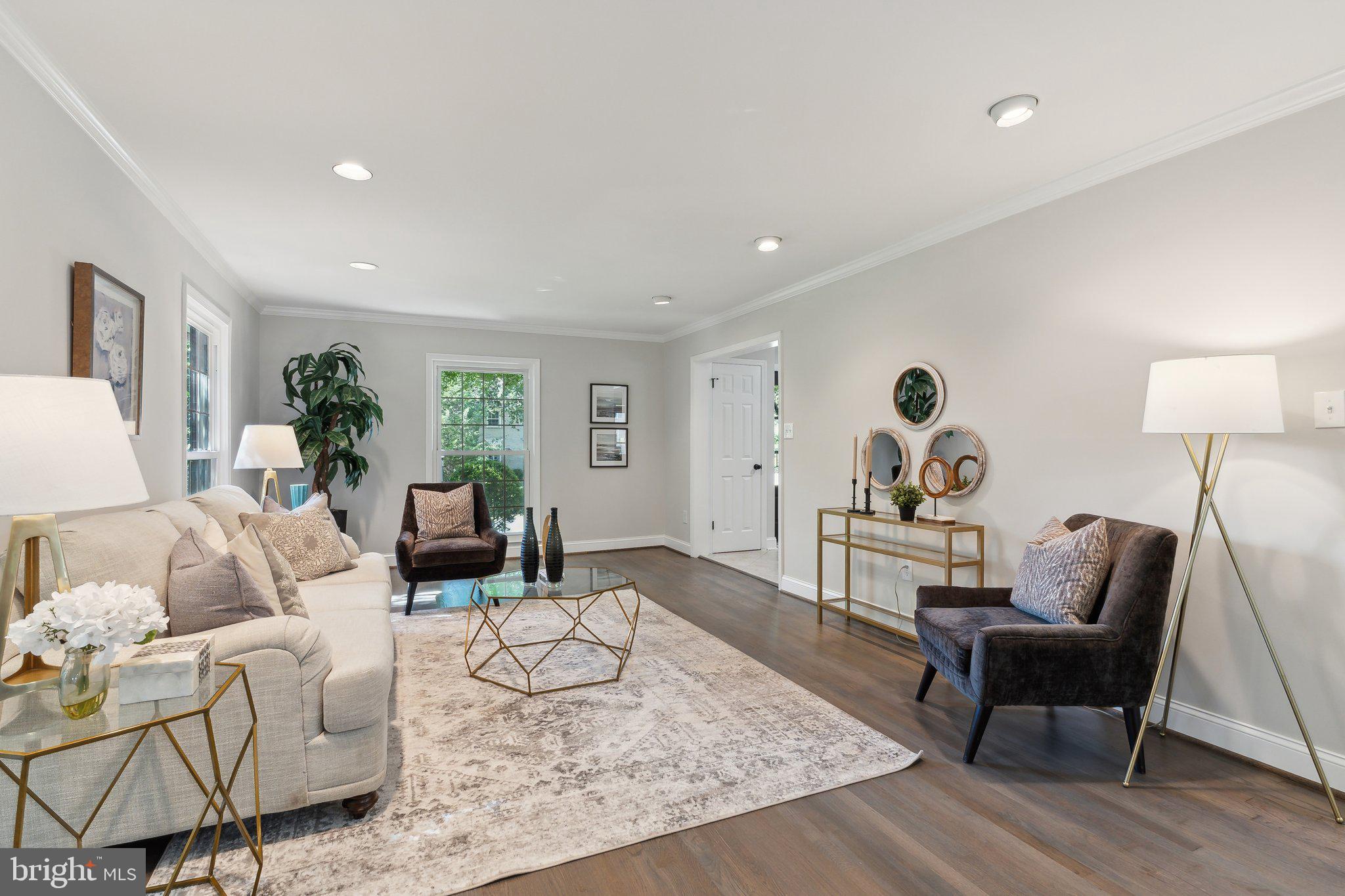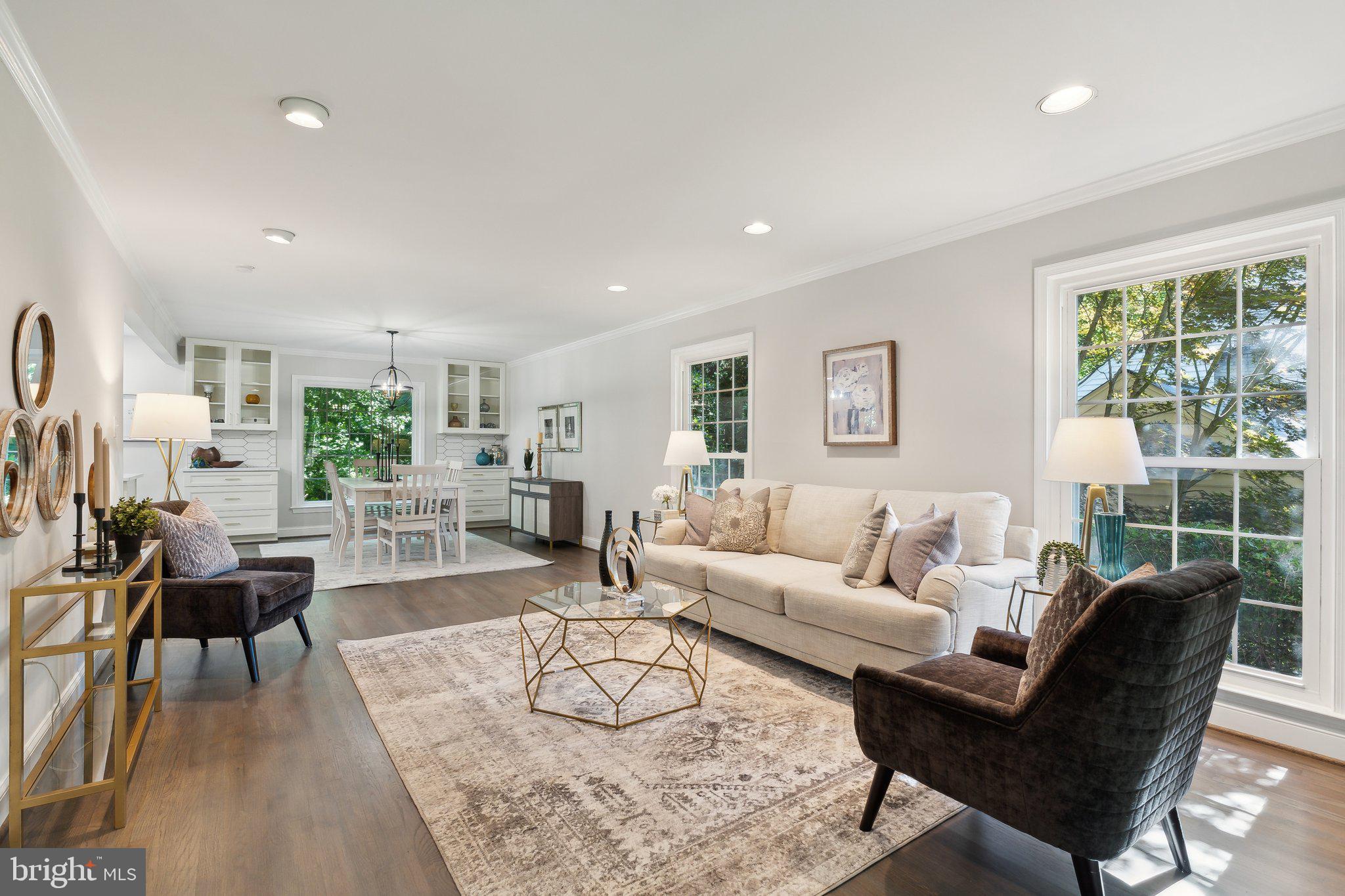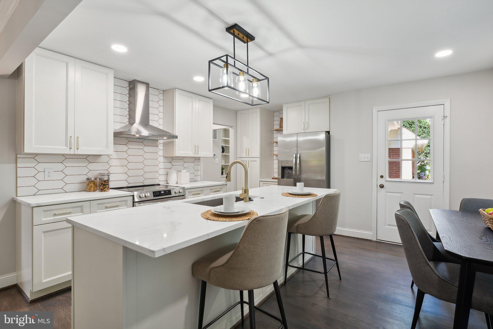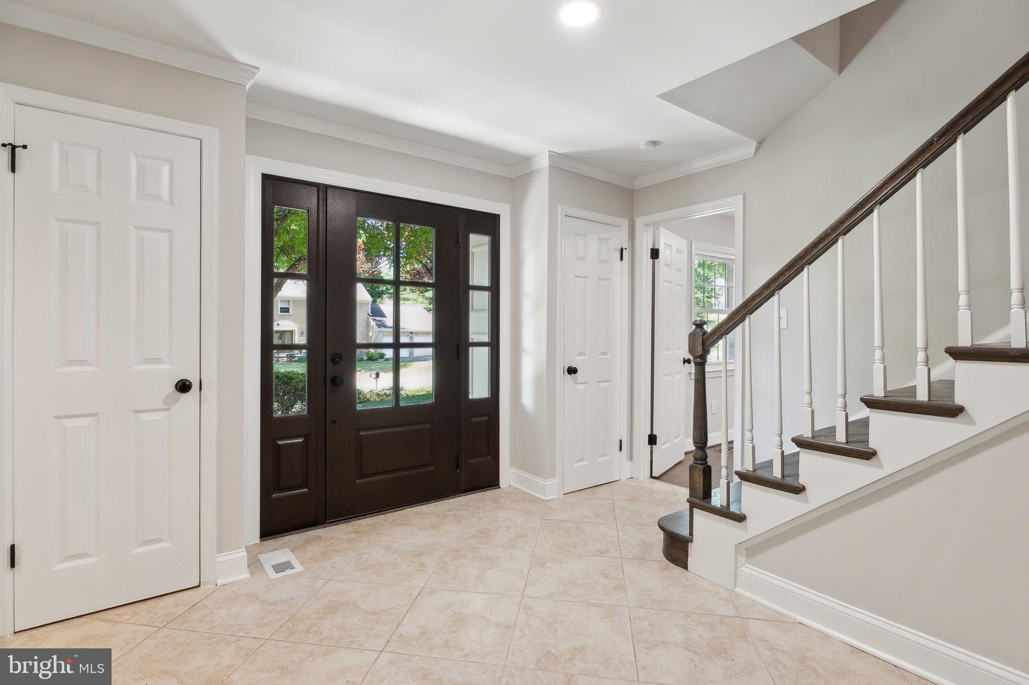 Step inside through the new exterior 3/4 glass door and be greeted by the large and inviting foyer leading into the main living areas. On the main level, you'll find a charming office/library with custom-built bookshelves, perfect for your home office or reading nook. Refinished hardwoods grace the living, dining, kitchen and family rooms on the main. The large and spacious living room offers ample space for entertaining or relaxing and provides a bright and inviting space to gather with family and friends. The dining room showcases beautiful glass-front cabinetry that complements the kitchen's aesthetic. The fully updated kitchen is a chef's paradise, boasting brand-new cabinetry, sleek quartz countertops, and sparkling stainless steel appliances. Whether you're whipping up a gourmet meal or enjoying a casual breakfast, this kitchen will make every moment special.