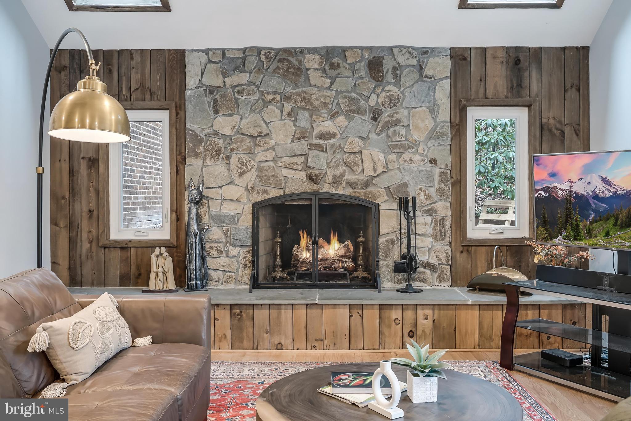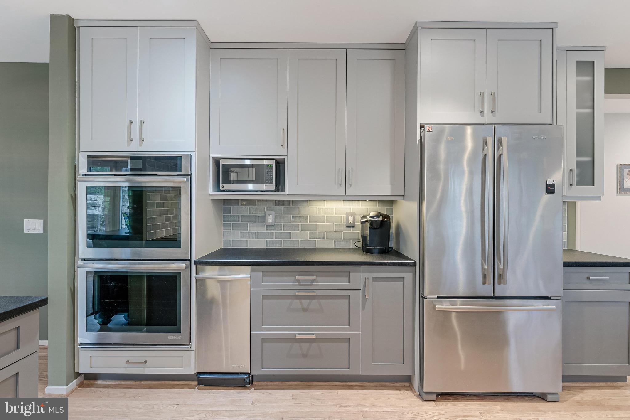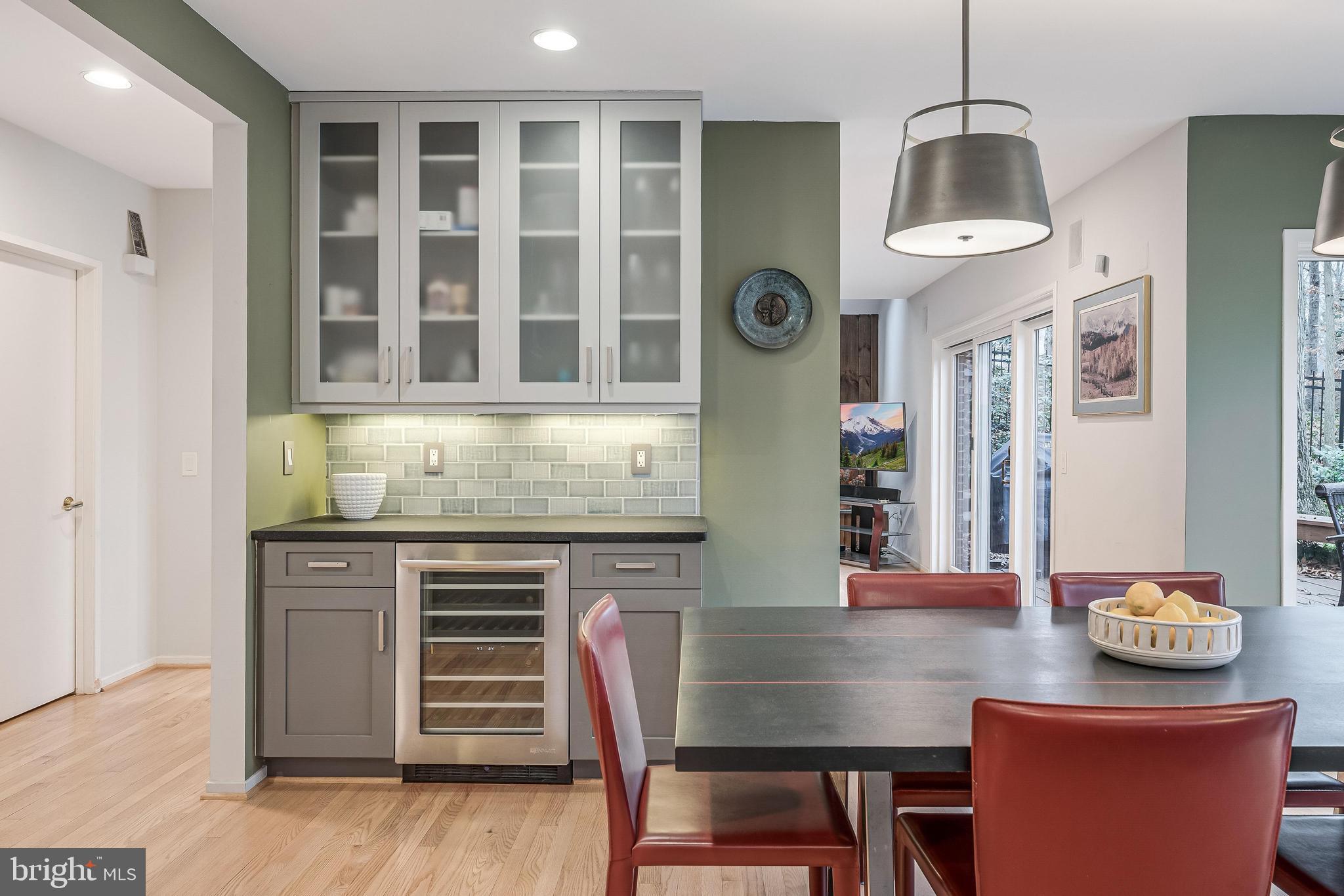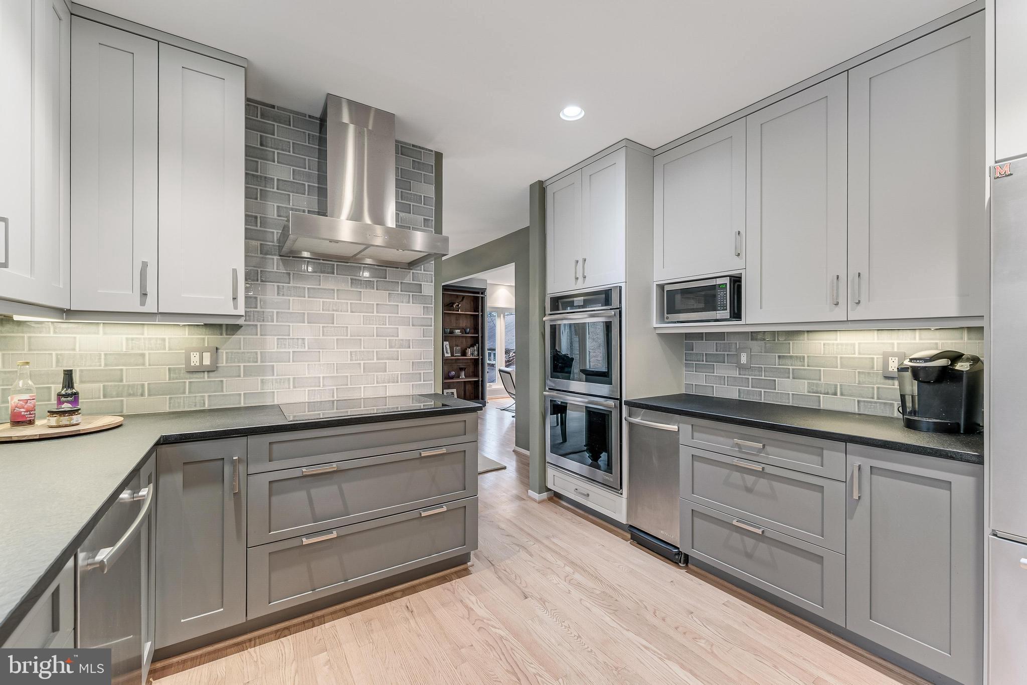 The chef's kitchen boasts custom cabinetry, leathered granite countertops, Jenn-Air induction cooktop with Zephr steel range hood, stainless JennAir appliances including double ovens, trash compactor, dishwasher and refrigerator and a large breakfast room with breakfast bar featuring JennAir Wine fridge and access to the private deck and fully fenced backyard. Open to the kitchen is a warm, Aspen-inspired family room with stone fireplace, skylights, built-ins, surround sound, and deck access.