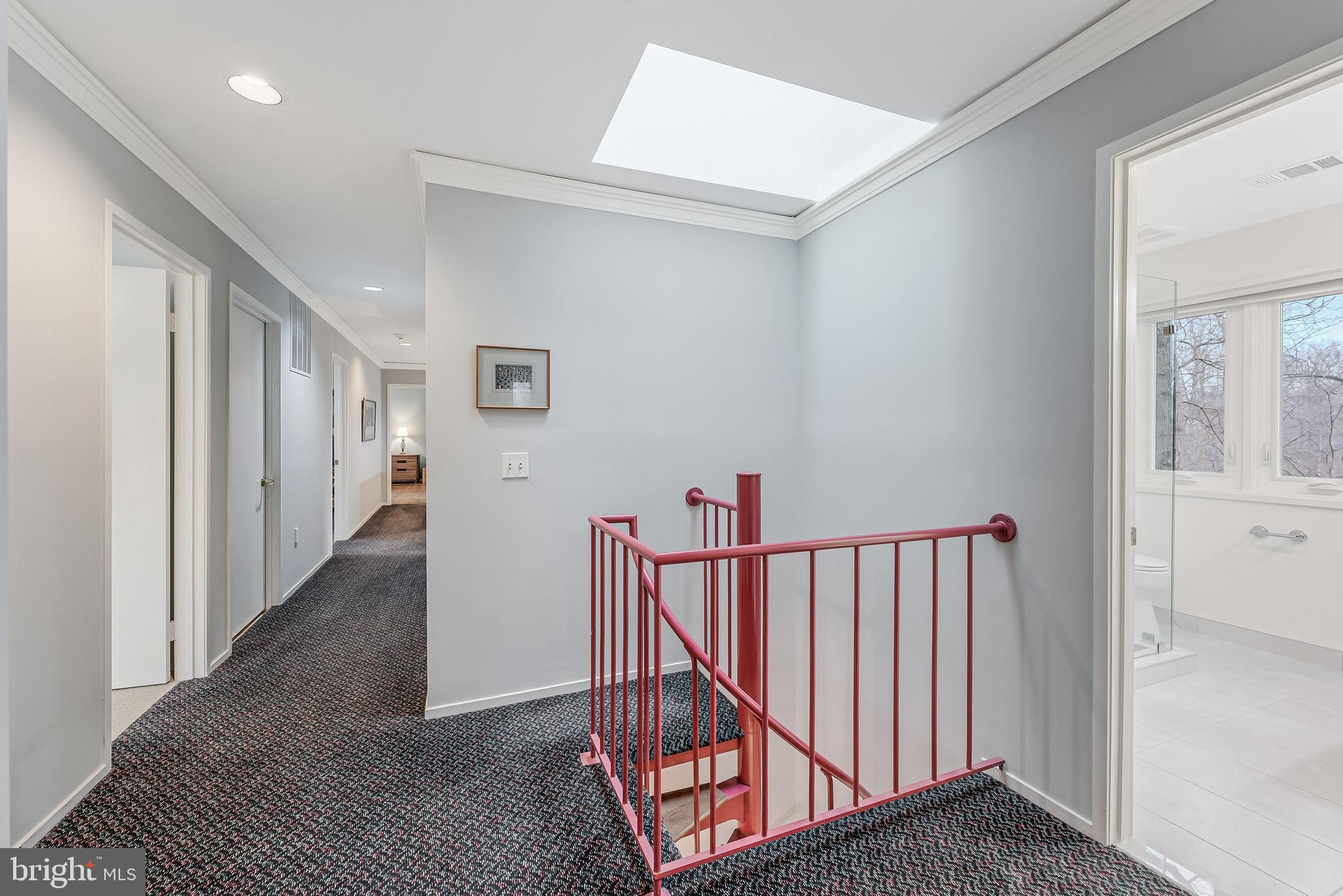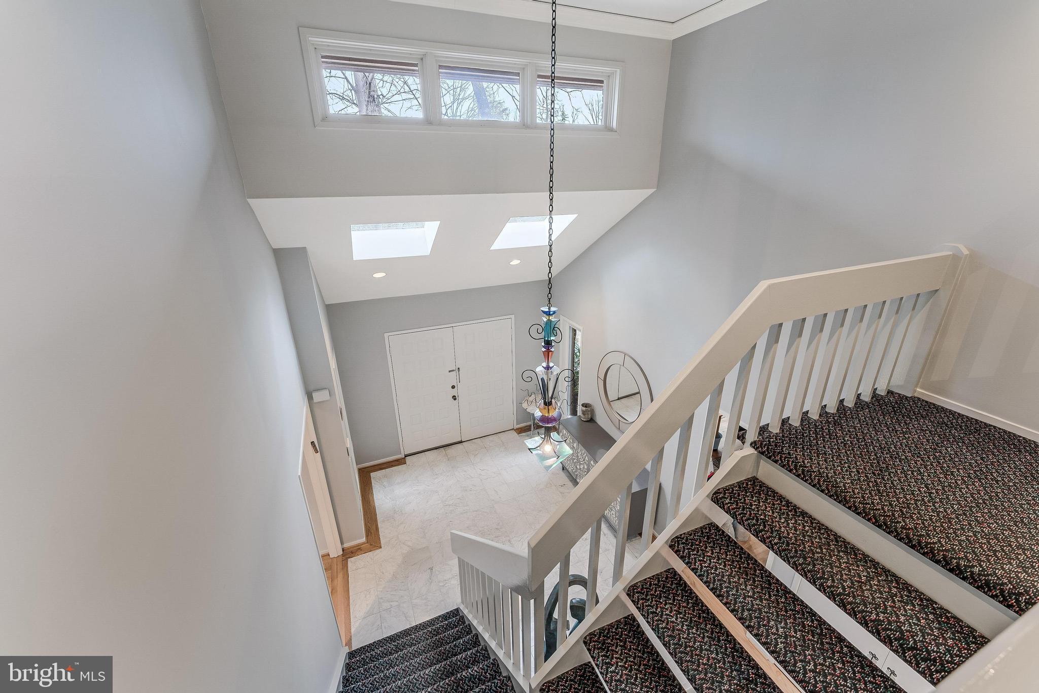 Stunning, light-filled home offering exceptional space, refined finishes, and a beautifully functional layout. A dramatic two-story foyer welcomes you with a custom chandelier, skylights, coat closet and marble flooring. Off the foyer is a private office with custom built-in work station and hardwood floors. The main level features a sun-filled living room and an elegant formal dining room, both with full window surrounds and hardwoods. A rear gallery hallway connects to a stylish powder room, walk-in pantry, and a spacious laundry/mudroom with access to the oversized two-car garage.